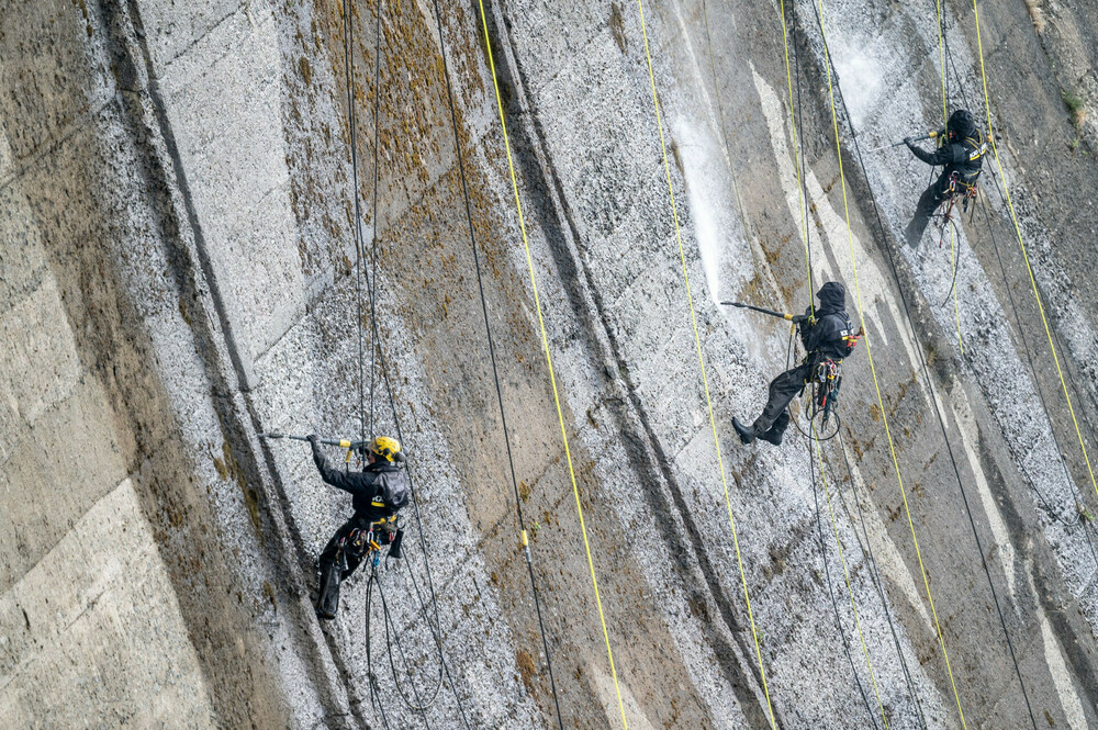 Um die Zeichnung anzubringen, hat Kärcher ein Team von Spezialisten zusammengestellt: Darunter Industriekletterer, die sich von der Dammkrone abseilen und ca. 1.100 Ökomarker auf der verschmutzten Oberfläche anbringen. Unterstützt werden sie von Vermessungstechnikern, die vom Boden aus die entsprechenden Stellen an der Wand mithilfe von Lasertechnik markieren. Im zweiten Schritt arbeiten die Kletterer mit Hochdruckreinigern nach dem Prinzip „Malen nach Zahlen“ das Motiv aus dem Schmutz, bestehend aus Moos, Flechten und Pilzbewuchs, heraus. Bei den Arbeiten wird besonderer Wert auf ein nachhaltiges Vorgehen gelegt: Das Wasser kommt aus dem Staubecken und der Strom vom Wasserkraftwerk der Staumauer.