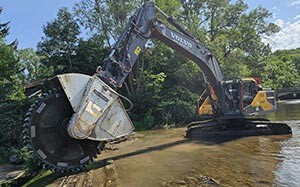 19.08.2024 KEMROC-Schneidrad DMW 220 Eine ausgediente Wehranlage in Stadtilm (Thüringen) wurde zurückgebaut, um den städtischen Abschnitt des Flusses Ilm wieder für Fische passierbar zu machen. Beim Zerkleinern der mächtigen...