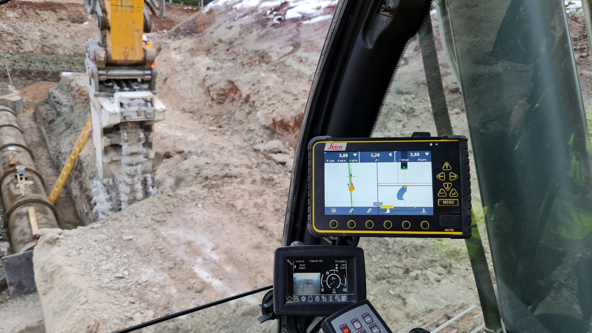 Nach eingehenden Beratungen mit Spezialisten des Herstellers KEMROC sowie des Baumaschinen-Handelspartners Carl Beutlhauser GmbH mietete man für dieses Vorhaben ein 42-t-Trägergerät zusammen mit einer KEMROC-Kettenfräse EK 150. Mit dieser Kombination versprach man sich genügend Leistung für den anspruchsvollen Einsatz im Kanalbau. Aber die Spezialisten von Beutlhauser Smart Systems ergänzten eine weitere technische Finesse, und zwar in Form einer Bagger-Maschinensteuerung. Versorgt mit Satelliten-Positionsdaten sowie mit Korrekturdaten von einer Referenzstation auf der Baustelle können die horizontale Position und die vertikale Lage des Baggers auf ein bis zwei Zentimeter genau ermittelt werden. Techniker von Beutlhauser sorgten auch für das Einmessen der KEMROC-Kettenfräse in das System sowie für die Einweisung der Baggerfahrer in die Systemsteuerung.