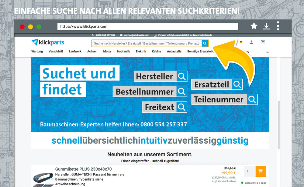 Mit nur einem Suchfeld kann bei klickparts nach allen relevanten Kriterien das passende Ersatzteil oder Wartungsprodukt für Baumaschinen gesucht werden.