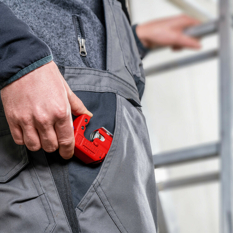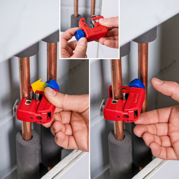 Die Anwendung ist – wie bereits von den größeren KNIPEX TubiX® Modellen bekannt – präzise, leicht und komfortabel: Einfach das geöffnete Werkzeug an das zu bearbeitende Rohr setzen und mithilfe der QuickLock- Einhandschnellfixierung präzise am Rohr ansetzen oder mithilfe der Skala den Rohrdurchmesser einfach voreinstellen und fest aufclipsen. So wird sichergestellt, dass der Rohrschneider unabhängig von der Handkraft zuverlässig auf dem Rohr verbleibt. Dies ist insbesondere bei Arbeiten in der Höhe oder in Schächten von Vorteil.