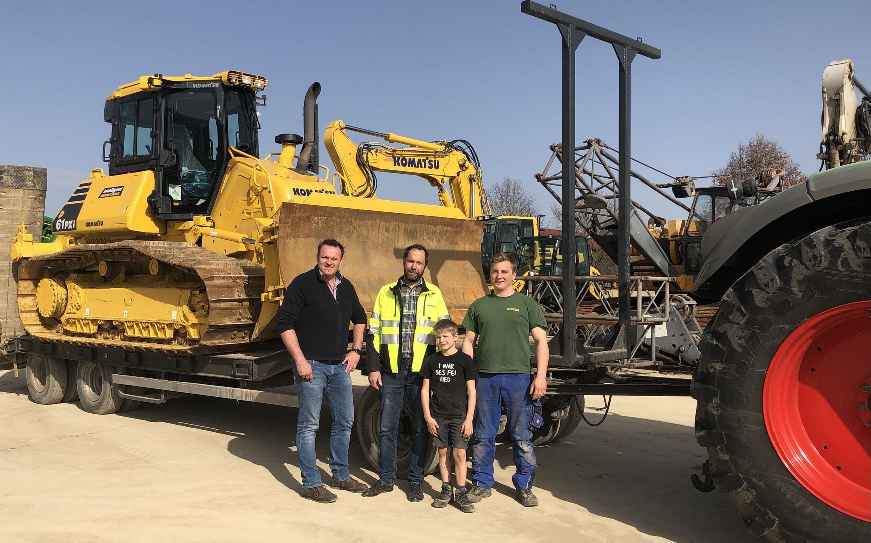 Unternehmer Föstl, selbst Experte für Transporte, holte seine neue Komatsu Raupe D61PXi direkt bei Kuhn Baumaschinen in Hohenlinden ab. (von links): Georg Föstl, Alexander Esterl, Gebietsverkaufsleiter Kuhn, Sohn Benedikt und Mitarbeiter Ludwig Huber.