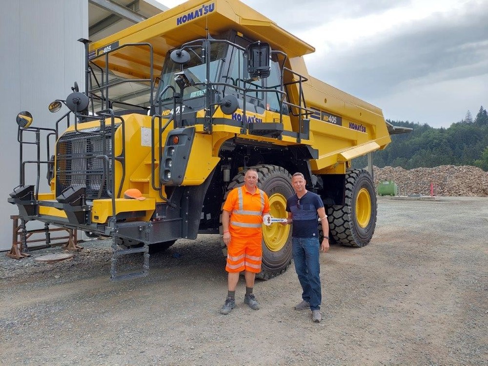 Gerhard Mautner (KUHN Verkauf Region Südsteiermark, re.) übergibt den Schlüssel für den Komatsu-Muldenkipper HD405-8.