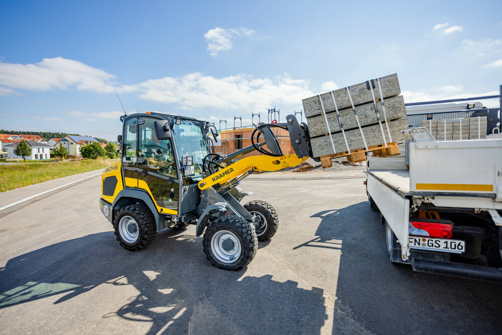 Ebenfalls mit auf der Bauma ist der neue kompakte Radlader 5045. Der Radlader überzeugt mit der Kombination aus geringem Eigengewicht und hoher Nutzlast. Mit einem Betriebsgewicht von ca. 2.600 Kilogramm kann der 5045 auf einem 3,5-Tonnen Anhänger (mautfrei) transportiert werden. Das spart nicht nur Zeit, sondern steigert auch die Maschinenauslastung. Das Verfahren von handelsüblichen Pflastersteinpaletten oder Steinpaketen sowie das Be- und Entladen von LKWs ist für den 5045 mühelos machbar. Die hohe Leistung bei kompakten Abmessungen erweitert das Einsatzspektrum für Einsätze in beengten Bereichen wie z. B. Tiefgaragen, Parkhäusern. Je nach Bedarf stehen zwei Motorvarianten zur Auswahl, standardmäßig ein 19 kW Motor und optional ein 33 kW Motor, mit dem bis zu 30 km/h gefahren werden kann. Zudem zeigt Kramer einen Querschnitt des aktuellen Maschinenportfolios, darunter auch die leistungsstarken Radlader der 8er-Serie, die mit ihrem effizienten Fahrantrieb neue Maßstäbe in Sachen Kraftstoffverbrauch setzt.