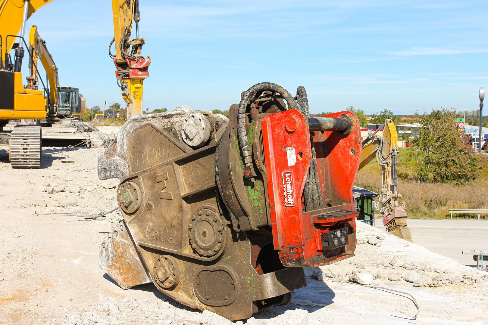 Mit Hydraulik-Hammer und Abbruchschere rückten zwei Kettenbagger auf der Brücke einer Überbauverbundplatte mit 50 t Bewehrungsstahl zu Leibe. Zwei weitere sortierten am Boden mit Greifern den Stahl. Alle zehn Minuten wechselten die Fahrer die Werkzeuge, um den Zeitplan einzuhalten. „Ohne Variolock VL 250-2 von Lehnhoff wäre das nicht zu schaffen gewesen“, sagt der Firmenchef.