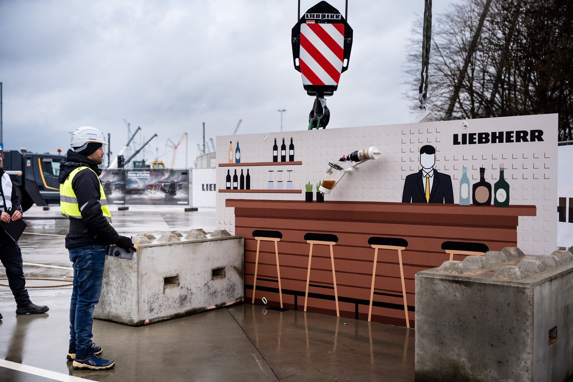 Fünf praxisnahe und theoretische Aufgaben, die höchste Präzision, technisches Verständnis und Nervenstärke verlangten, erwarteten die Kranfahrer im Ehinger Liebherr-Werk. Während zweier Tage galt es Traglasten und Rüstzustände zu berechnen, Krane zu konfigurieren und Lasten zu transportieren – stets unter der Beobachtung einer strengen Jury. Dabei rotierten die Kranfahrer parallel von einer Station zur nächsten: Im Schulungszentrum mussten zum einen verschiedene Lasten wie Betonkübel und -steine korrekt an einen Hallenkran angeschlagen werden, während im Außenbereich ein Container – in dessen Innerem Pylone und eine Becherpyramide errichtet waren – um ein Hindernis gefahren werden musste.