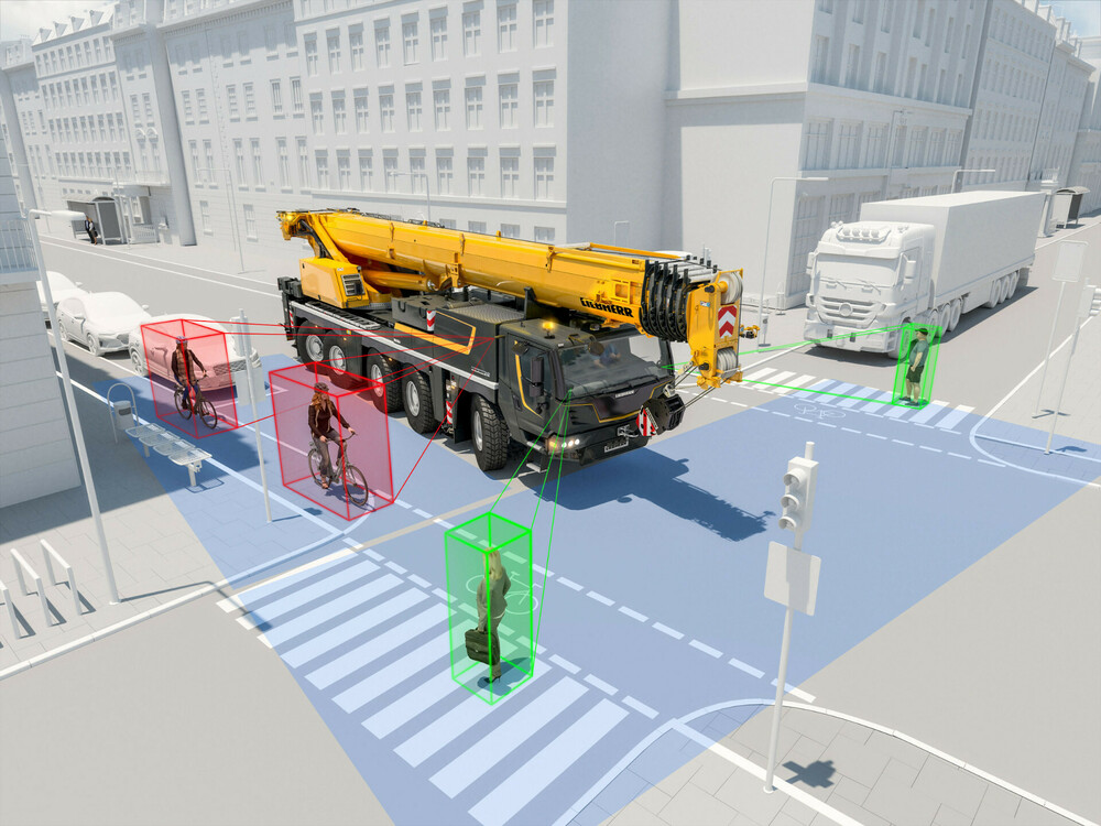 Die Fahrerassistenzsysteme scannen die Umgebung und warnen den Kranfahrer, um Unfälle zu vermeiden.