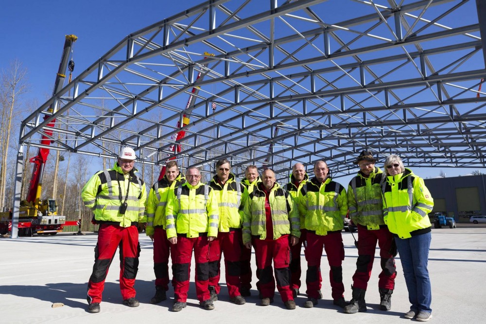 Als die Last dann etwa einen Meter gehoben war, kamen die Stahlbauer zum Zug: Auf jeden der sechs Pfeiler wurde ein 75 Zentimeter hohes Verlängerungsstück aufgesetzt und verschraubt. Das exakte Absenken des Dachs danach war professionelle Routine. Bereits vier Stunden nach Eintreffen der gelb-roten Fahrzeuge auf der Baustelle war der Auftrag erfolgreich ausgeführt. Ein Kraneinsatz wie aus dem Lehrbuch.
