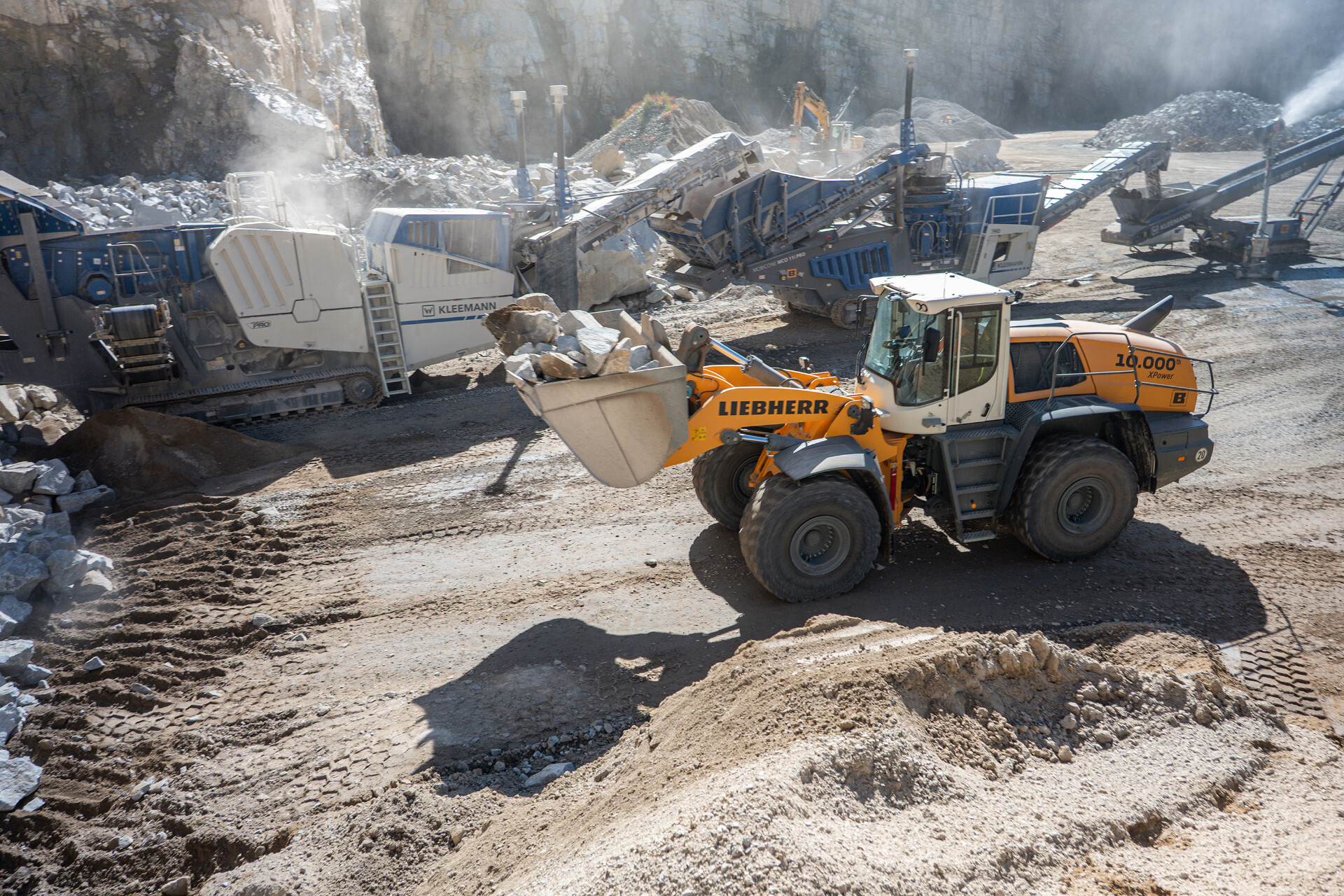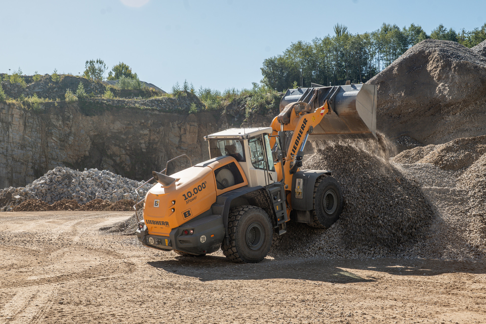 Der L 580 XPower-Radlader beschickt Brechanlagen mit grobem Gestein, haldet das anschließend zerkleinerte Material im Steinbruch auf und verlädt die Endprodukte auf Lkws. Ein Liebherr-Raupenbagger R 934 mit Hydraulikhammer arbeitet mit dem Jubiläumsradlader zusammen und zerkleinert vorab große Gesteinsbrocken. Bei Staub, Schmutz und unebenem Gelände erweist sich der Jubiläumsradlader als kraftvolle, robuste Maschine mit einer hohen Umschlagleistung. „Der XPower-Radlader überzeugt durch seine Produktivität, den geringen Dieselverbrauch und den Bedienkomfort. Unsere Fahrer sind einfach begeistert und setzen die Maschine gerne ein, um ihren Arbeitsalltag effizient zu gestalten“, bestätigt Gruber.