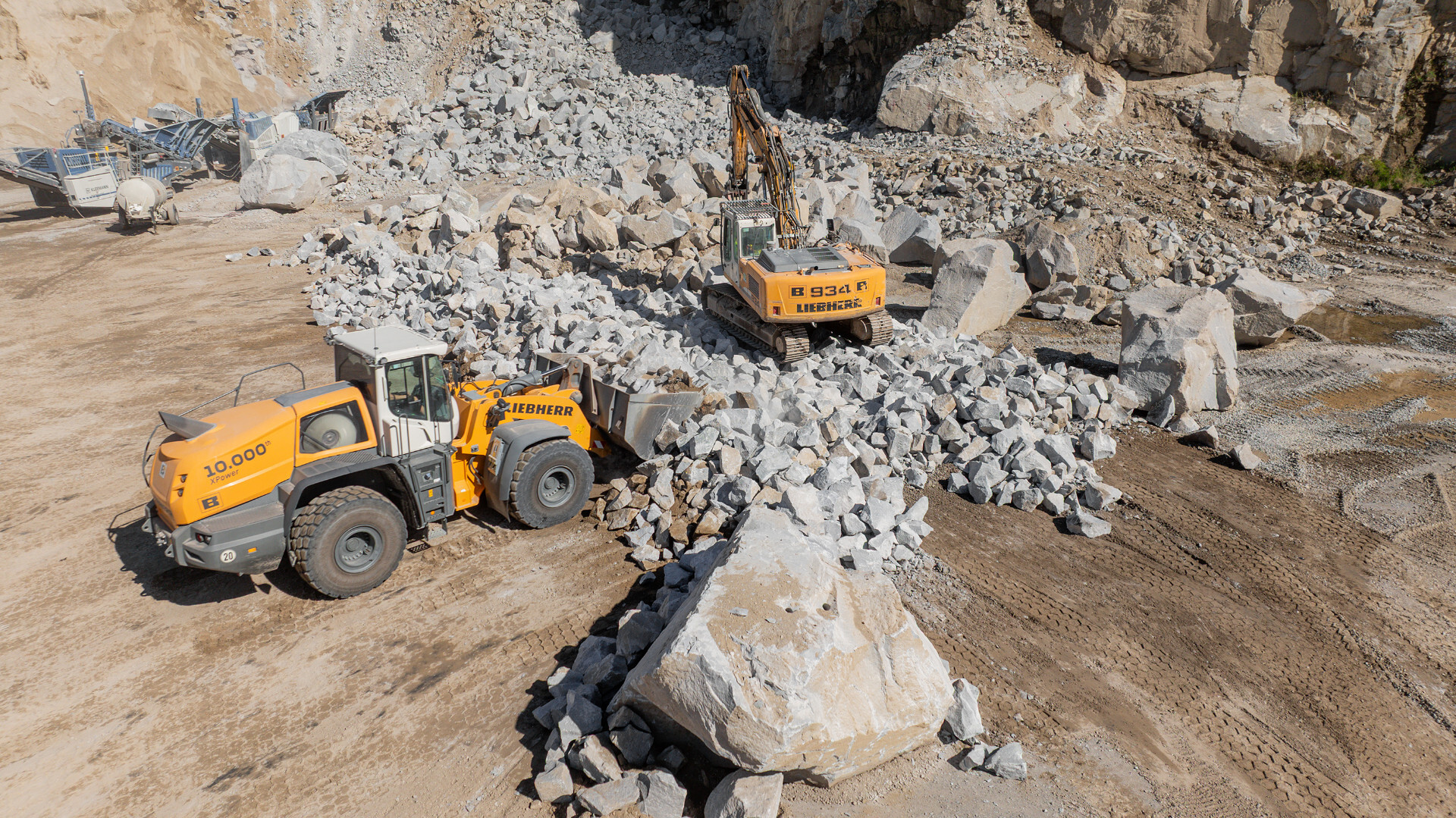 Teamarbeit: Ein Liebherr-Raupenbagger zerkleinert Gesteinsbrocken, die Jubiläumsmaschine transportiert das Material anschließend ab.