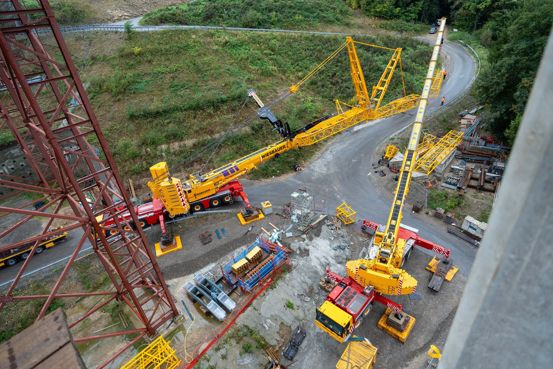 Der LR 1700-1.0 wurde ungefähr in der Mitte des Tales direkt vor dem Brückenabschnitt aufgebaut, wo die schwereren Stahlplatten montiert werden mussten. So konnte er diese Lasten allein bewältigen. Für die weiter südlich gelegenen Positionen war aufgrund der größeren Ausladung ein Tandemhub notwendig, bei dem der Raupenkran gemeinsam mit dem LTM 1650-8.1 arbeitete. Dabei legte der LR 1700-1.0 die 85-Tonnen-Last zunächst auf eine erreichbare Position auf der Brücke ab, von wo sie von beiden Kranen gemeinsam an ihre endgültige Position geschwenkt und millimetergenau abgesetzt wurden.