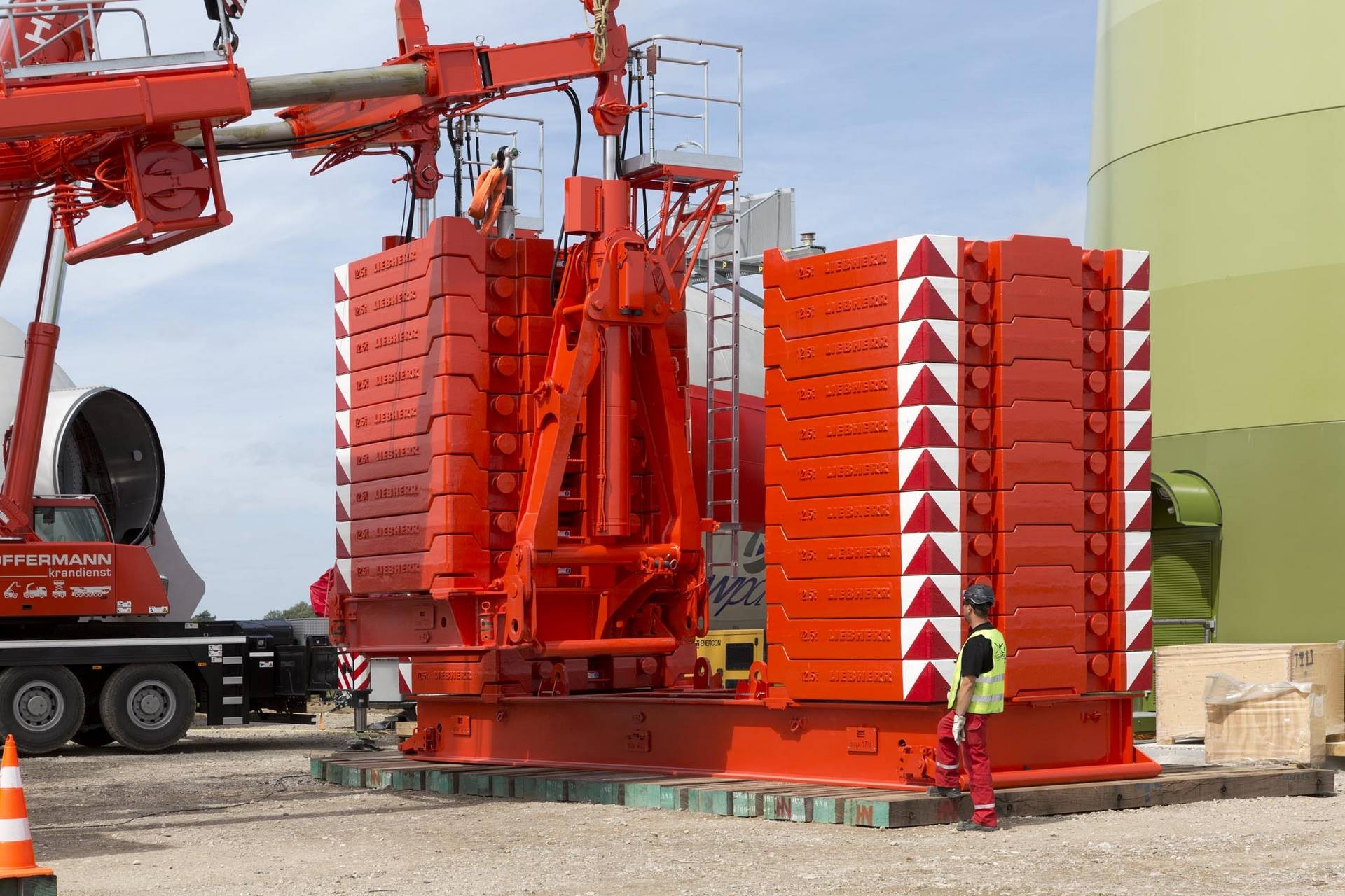 „Wir brauchen hier nur 110 Tonnen VarioTray-Ballast für den Hub des Generators mit einem Gewicht von brutto 92 Tonnen, dem schwersten Teil der Anlage", erklärt Hüffermanns Kranfahrer Heiner Kluck. Im Wechsel mit seinem Kollegen Sven Jakobs steuert Kluck den neuen Raupenkran von Hüffermann. Bis vor kurzem war sein Arbeitsplatz noch in der Führerkabine von Liebherr-Mobilkranen. „Das ist natürlich schon eine andere Nummer und eine vermeintlich große Umstellung. Aber der Umstieg ist mir überhaupt nicht schwergefallen", kommentiert er den Wechsel auf den Großkran. Sein Fazit nach zehn Wochen: „Der Kran lässt sich wunderbar ansteuern und auch sehr feinfühlig und sensibel verfahren. Ich bin sehr zufrieden damit."