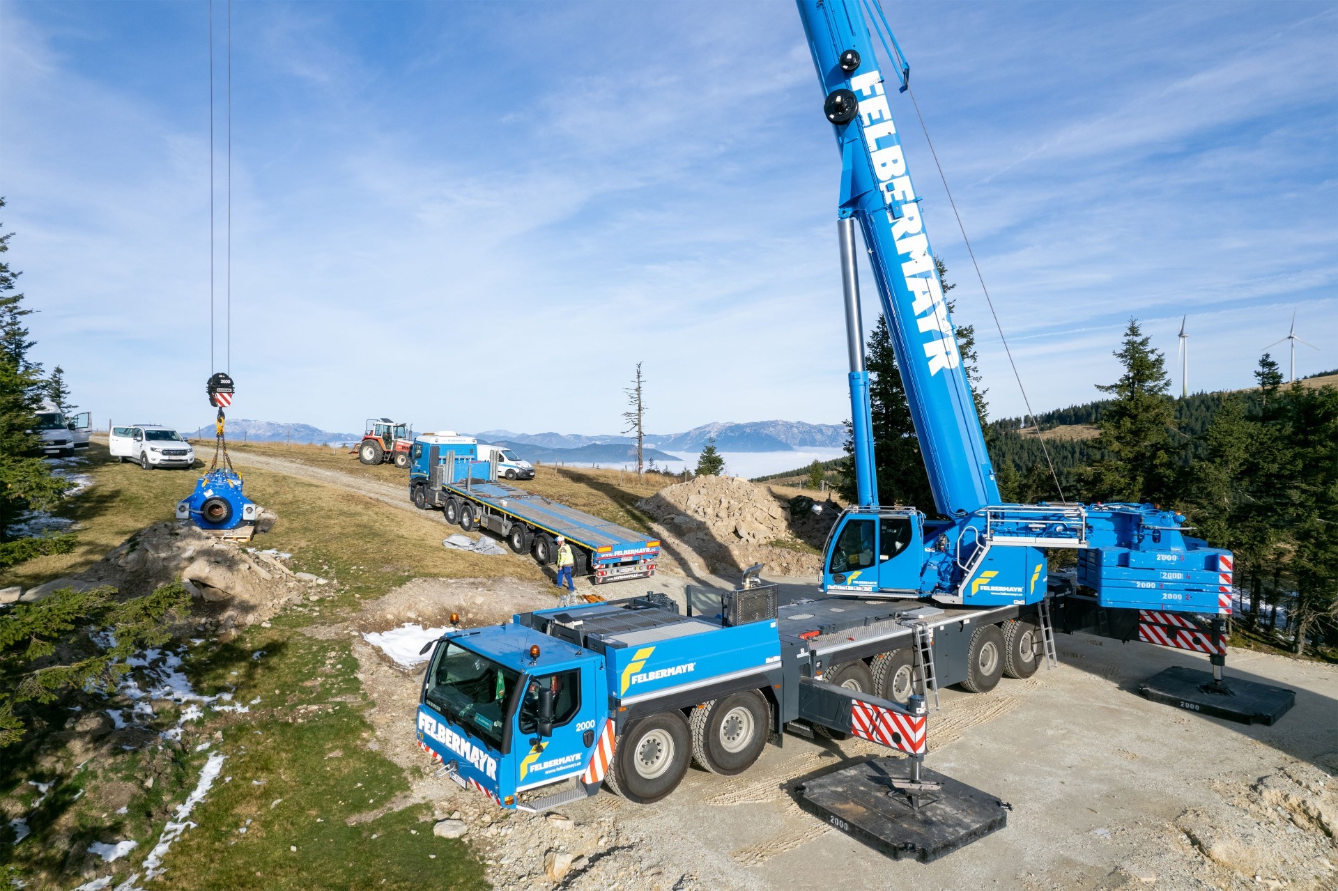 Im Oktober schickte der österreichische Kranvermieter Felbermayr seinen neuen Liebherr-Mobilkran LTM 1300-6.3 in einen Windpark im Osten des Landes. Auf einem Bergrücken in knapp 1.600 Höhenmetern musste das defekte Getriebe einer Windkraftanlage ausgetauscht werden. Trotz Böen von bis zu dreizehn Metern pro Sekunde konnte der Kran das zwölf Tonnen schwere Bauteil aus dem Maschinenhaus in etwa 65 Metern Höhe auswechseln.