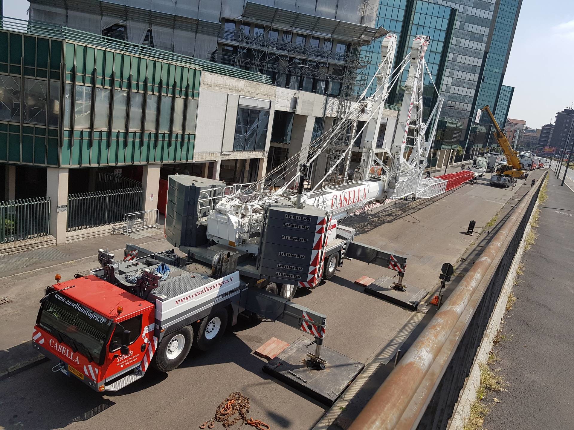Mailand, eine lebhafte Großstadt in Norditalien, vor allem bekannt für den Dom und seine Einkaufspassagen, ist auch eines der wichtigsten Industriezentren des Landes. Permanent finden Umbauten und Restrukturierungsmaßnahmen statt, da die Stadt und ihr Ballungsraum buchstäblich aus allen Nähten platzt. Casella Autogrù wurde beauftragt, während der Umbaumaßnahmen eines Wolkenkratzerkomplexes in der Innenstadt von Mailand mehrere Hübe durchzuführen. Der Gebäudekomplex besteht aus sieben Hochhäusern, die vor allem Büros beherbergen und sehr eng aufeinander stehen. Casella’s Auftrag war konkret der Hub von Klimaanlagen auf das Dach des 18-stöckigen Gebäudes, hier wurde eine Hubhöhe von rund 70 Metern benötigt. Die Wahl fiel auf einen LTM 1350-6.1 gewählt, um die einzelnen Anlagen mit je 12,5 t Gewicht zu platzieren.