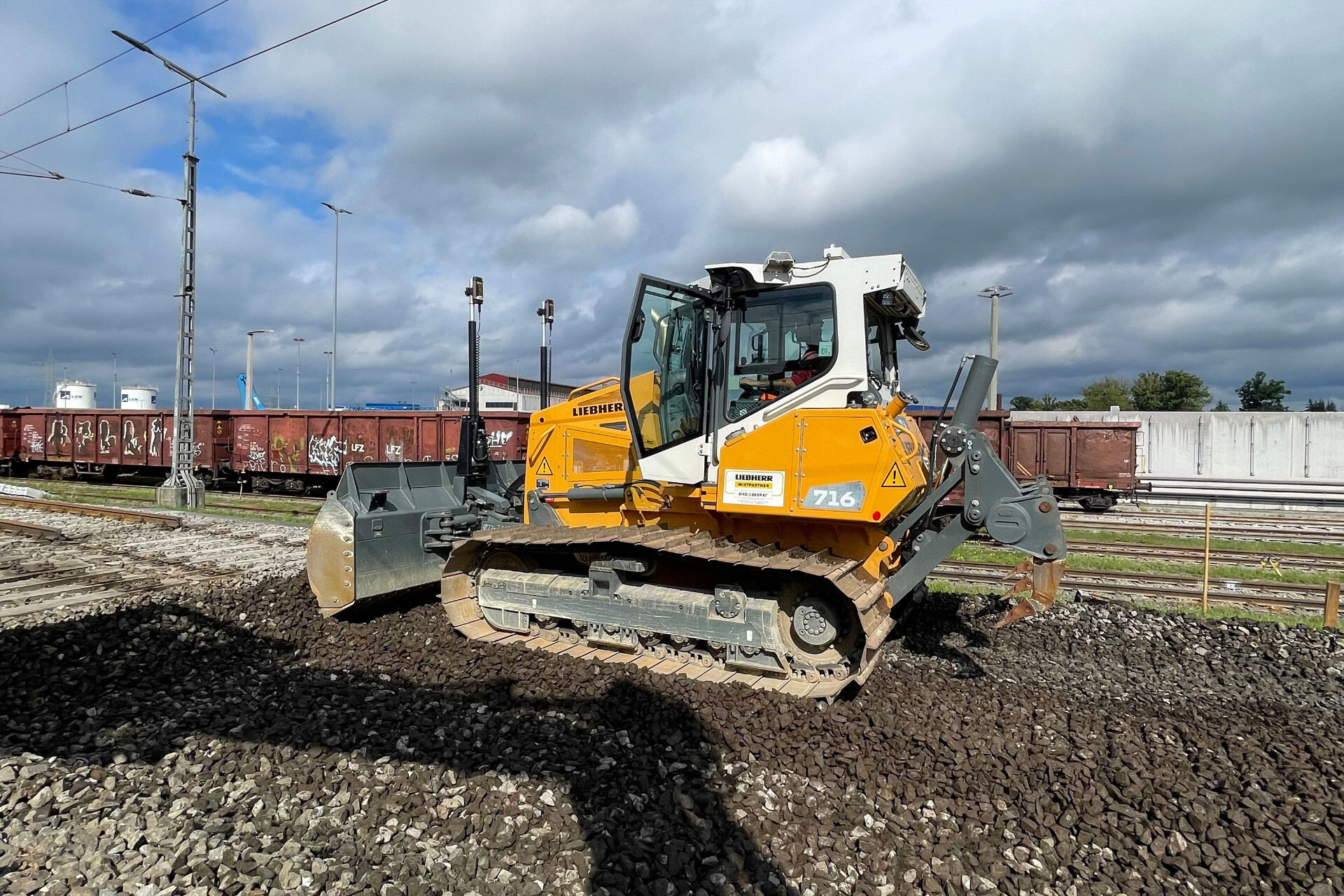 Für die Erd- und Gleisbauarbeiten kamen zwei Mietmaschinen von Liebherr-Mietpartner GmbH zum Einsatz: ein Zweiwegebagger A 922 Rail sowie eine Planierraupe PR 716, ausgestattet mit Leica 2D-Maschinensteuerung. Der A 922 Rail übernahm zunächst das Abziehen und Ausschachten des Planums im Bereich der neuen Weichen. Anschließend wurde mit der PR 716 die Verlegeplanie millimetergenau hergestellt – ein entscheidender Schritt für die spätere Positionierung der Schwellen. Die Leica Maschinensteuerung ermöglichte dabei eine exakte Höhen- und Lagegenauigkeit, die für den Einbau der Betonschwellen unerlässlich war. Nach Abschluss der Feinplanie wurde das Planum verdichtet, bevor der Zweiwegebagger von Liebherr erneut zum Einsatz kam: Er unterstützte beim Auflegen der Betonschwellen und bei der Montage des Gestänges auf dem neu hergestellten Untergrund.