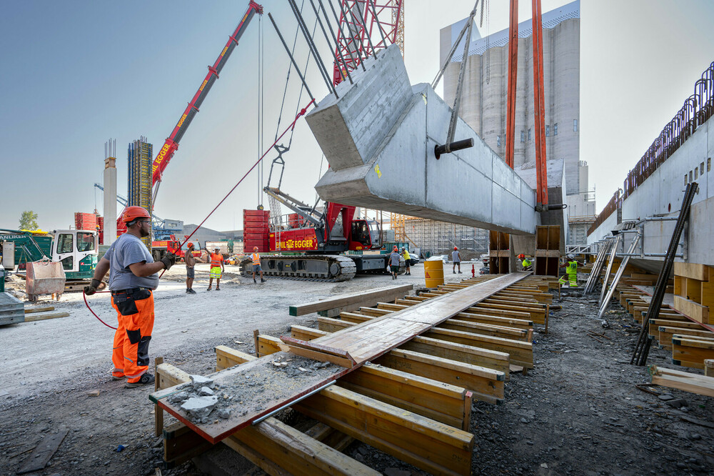 Gegen Ende des Einsatzes übernahm der LTM 1650-8.1: Er sorgte für den Lückenschluss bei den Wandscheiben in Ortbeton und montierte die letzten sechs Knochenträger. Der neue Mobilkran hob die rund 90 Tonnen schweren und 32 Meter langen Träger bei einer Ausladung von rund 14 Metern ein. Dazu musste der 650-Tonner nach jeweils zwei Trägern innerhalb der Baustelle verfahren.