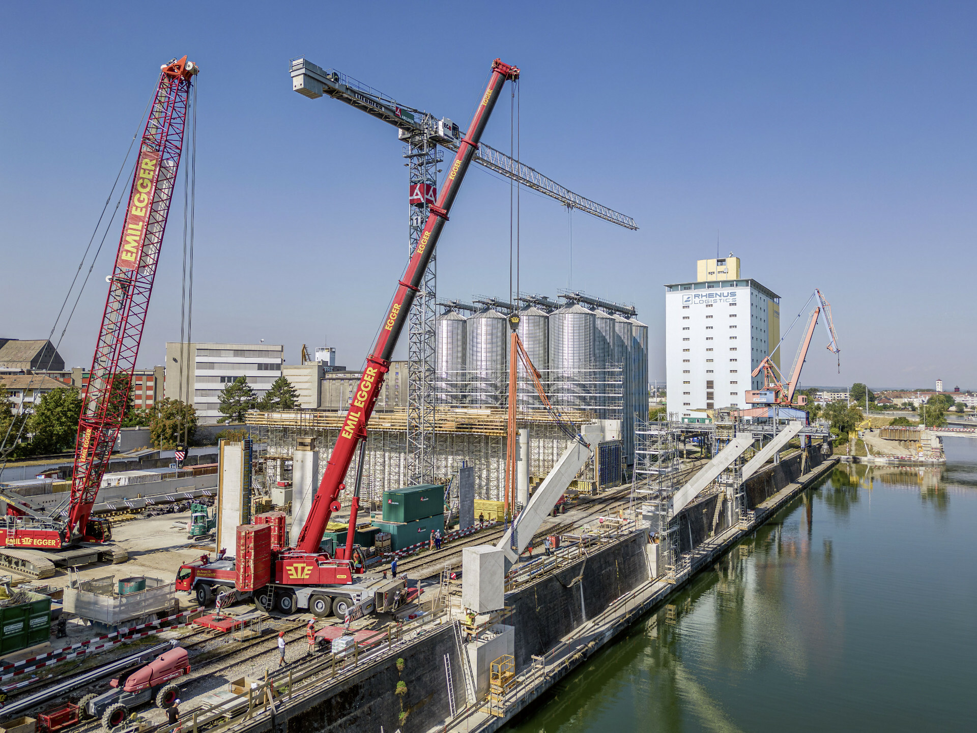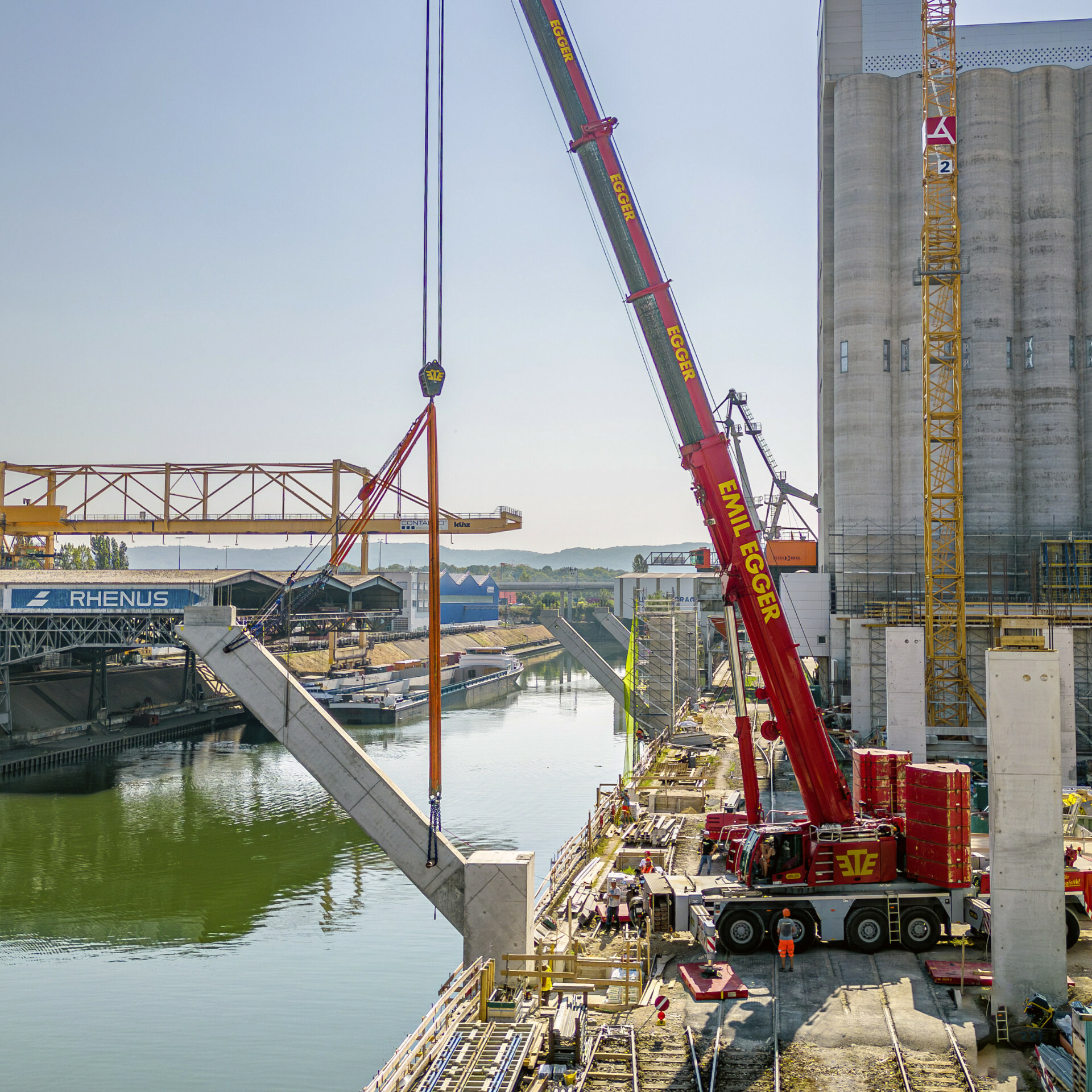 Ehingen - Im Rheinhafen Basel-Kleinhünigen (Schweiz) investiert die Rhenus Port Logistics in ein neues Umschlag-Terminal. Mit der Logistik der vorgefertigten Betonelemente wurde die Emil Egger AG betraut. Um in allen Bauphasen möglichst effizient agieren zu können, waren vier Liebherr-Krane in Basel im Einsatz.