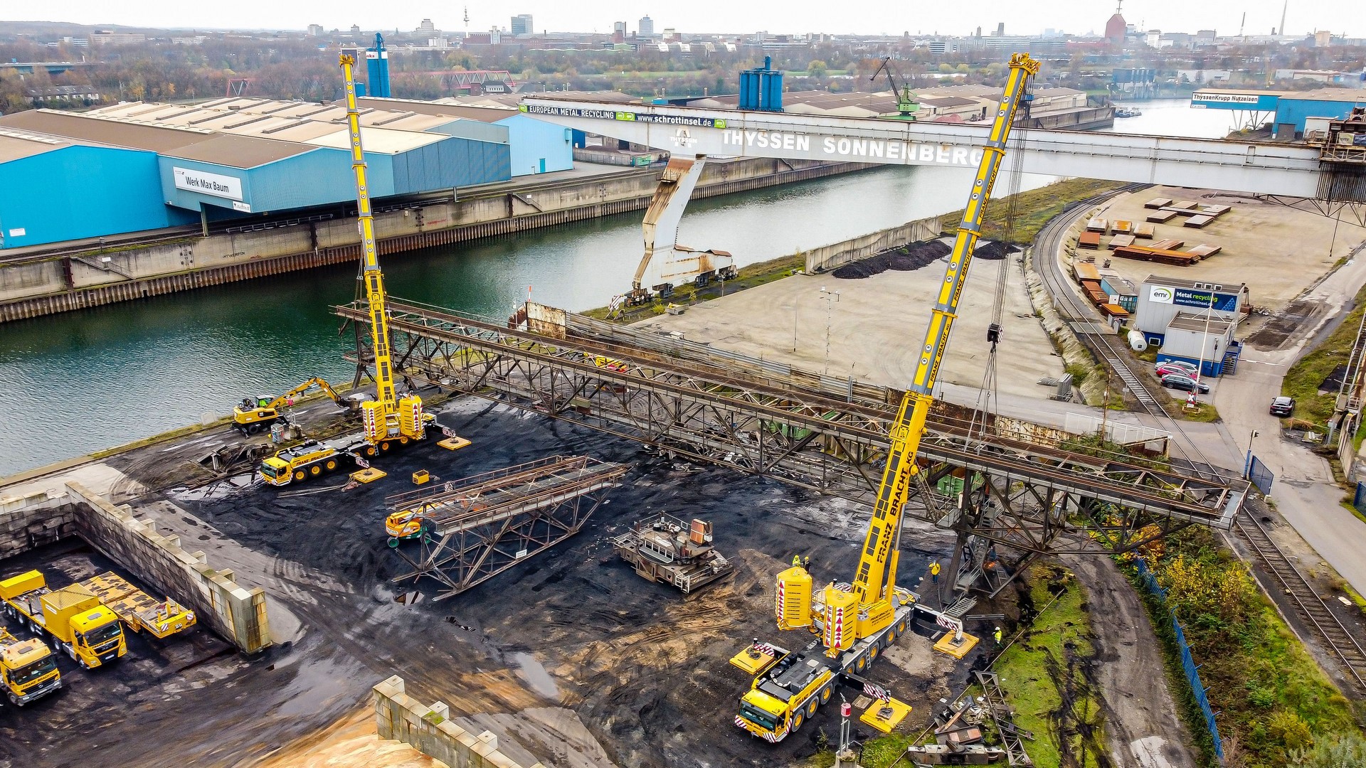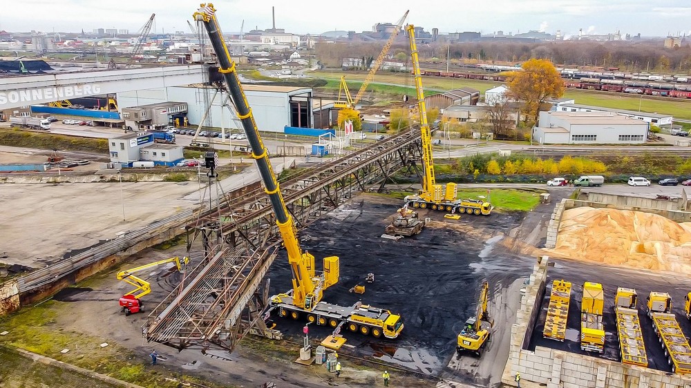 Die übrige Konstruktion, die dann noch knapp 200 Tonnen wog, wurde im Tandemhub planmäßig und problemlos von den beiden 450-Tonnern demontiert. Ein echter Schnelleinsatz: Um sechs Uhr morgens waren die beiden Krane zugbereit, um 15 Uhr war der gesamte Job bereits erledigt.