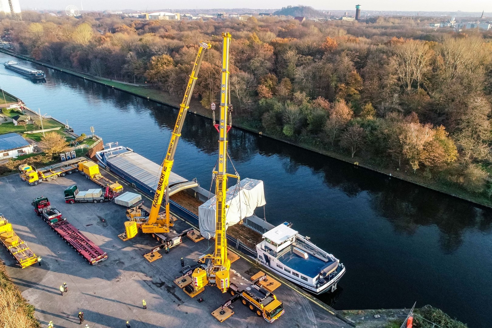 Genau eine Woche später und rund 20 Kilometer entfernt teilte sich der LTM 1450-8.1 aus Duisburg einen Schwerlast-Einsatz mit einem LTM 1400-7.1 von der Niederlassung in Unna. Im Hafen von Oberhausen musste eine 110 Tonnen schwere Turbine aus einem Binnenschiff gehoben werden. Mit Anschlagmitteln und Dreieckstraverse ergab sich eine Bruttolast von 120 Tonnen, die die beiden Krane bei einer Ausladung von 15,6 Metern bewältigen mussten.