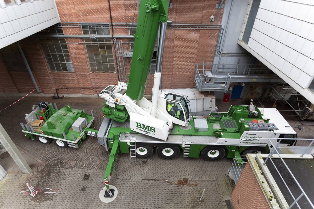 Doch Klaus Nielsen, Kranfahrer beim dänischen Kranbetreiber BMS, bereitet die Raumnot nur wenig Kopfzerbrechen: Auch hier schaffen die auf 33 und 41 Prozent nur teilweise teleskopierten Stützen Abhilfe. Passgenau hat Nielsen zuvor seinen Kran samt Anhänger rückwärts durch eine schmale Gasse zum Einsatzort manövriert. Auf diesem zweiachsigen Hänger führt der Fahrzeugkran Ballastplatten, Unterleghölzer und eine zweite Hakenflasche mit. In der Regel können dadurch sämtliche Einsätze ohne weiteres Fahrzeug erledigt werden – ein gewaltiger ökonomischer Vorteil. Vorteilhaft ist auch, dass Liebherr den neuen 90-Tonnen-Mobilkran mit einem 60 Meter langen Teleskopausleger ausgestattet hat, zehn Meter mehr als beim Vorgängermodell. Beim Einsatz in Aarhus kann die Last dadurch ohne Verwendung einer Gitterspitze ans Ziel transportiert werden.