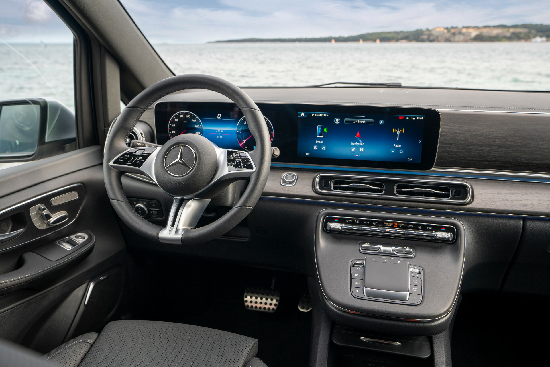 Das intuitive Anzeige- und Bedienkonzept unterbreitet personalisierte Vorschläge für zahlreiche Infotainment-, Komfort- und Fahrzeugfunktionen. Die Bedienung erfolgt auf dem Zentraldisplay, den TouchControl-Panels am Lenkrad, dem Touchpad auf der Mittelkonsole oder über den dialog- und lernfähigen Sprachassistenten „Hey Mercedes“, der ebenfalls optimiert wurde. Weitere Vorteile der neuen MBUXGeneration sind eine erhöhte Rechenleistung, zusätzliche elektrospezifische Funktionen und Ansichten für den EQV sowie unterstützende Features beim Parken, die über das Zentraldisplay angezeigt werden.