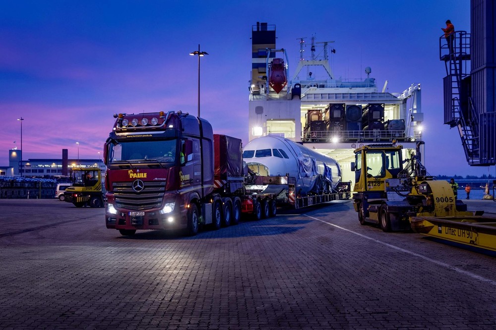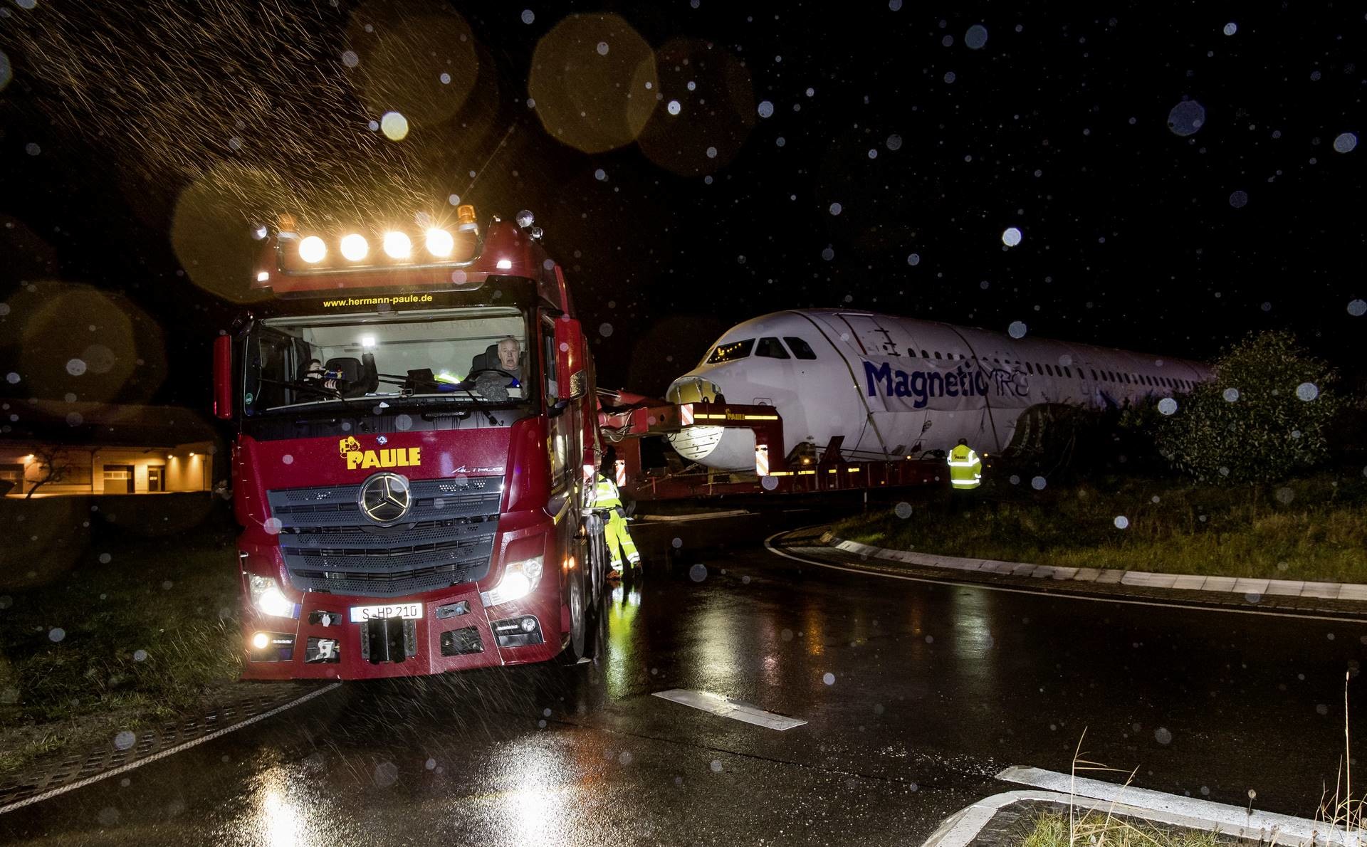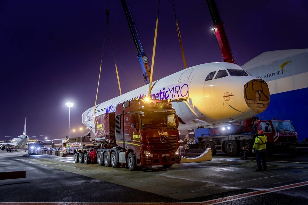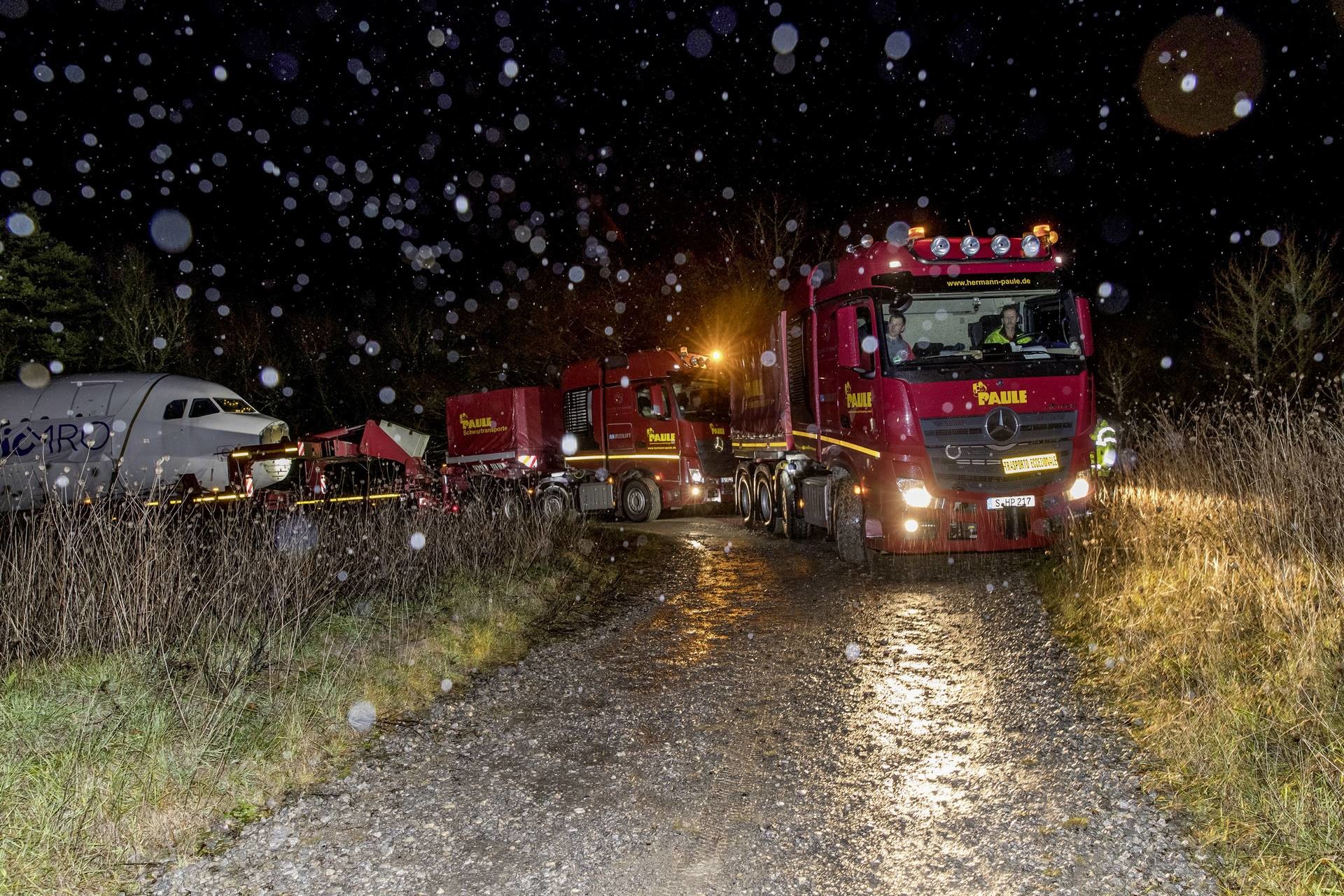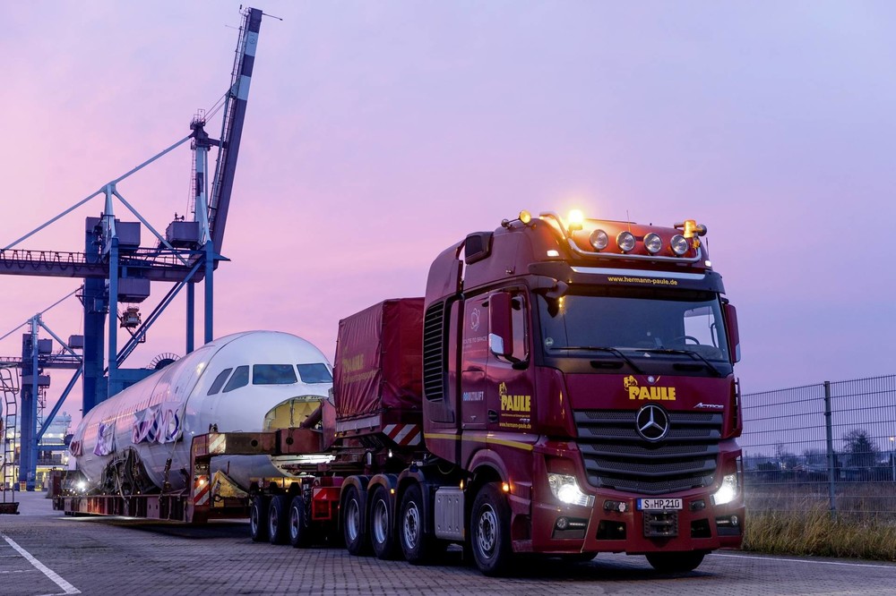 Stuttgart, 11.01.2019 - Ein Airbus A 320 im Tiefflug durchs nächtliche Deutschland: Mit einer Schwerlastzugmaschine Actros SLT von Mercedes-Benz fuhr ein Schwertransport durch die Republik und zog überall größte Aufmerksamkeit auf sich. Bei den Superlativen kein Wunder: 60 m lang, 90 t schwer, 5 m breit. Der Actros SLT hat rund 630 PS und bringt den Airbus A 320 in den Süden Deutschlands. Der aufsehenerregende Transport des Flugzeugrumpfes dauerte rund 11 Tage. In Tallinn/Estland wurde der – bei einer harten Landung beschädigte – Airbus auf den Actros SLT des Stuttgarter Schwertransportunternehmens PAULE verladen.