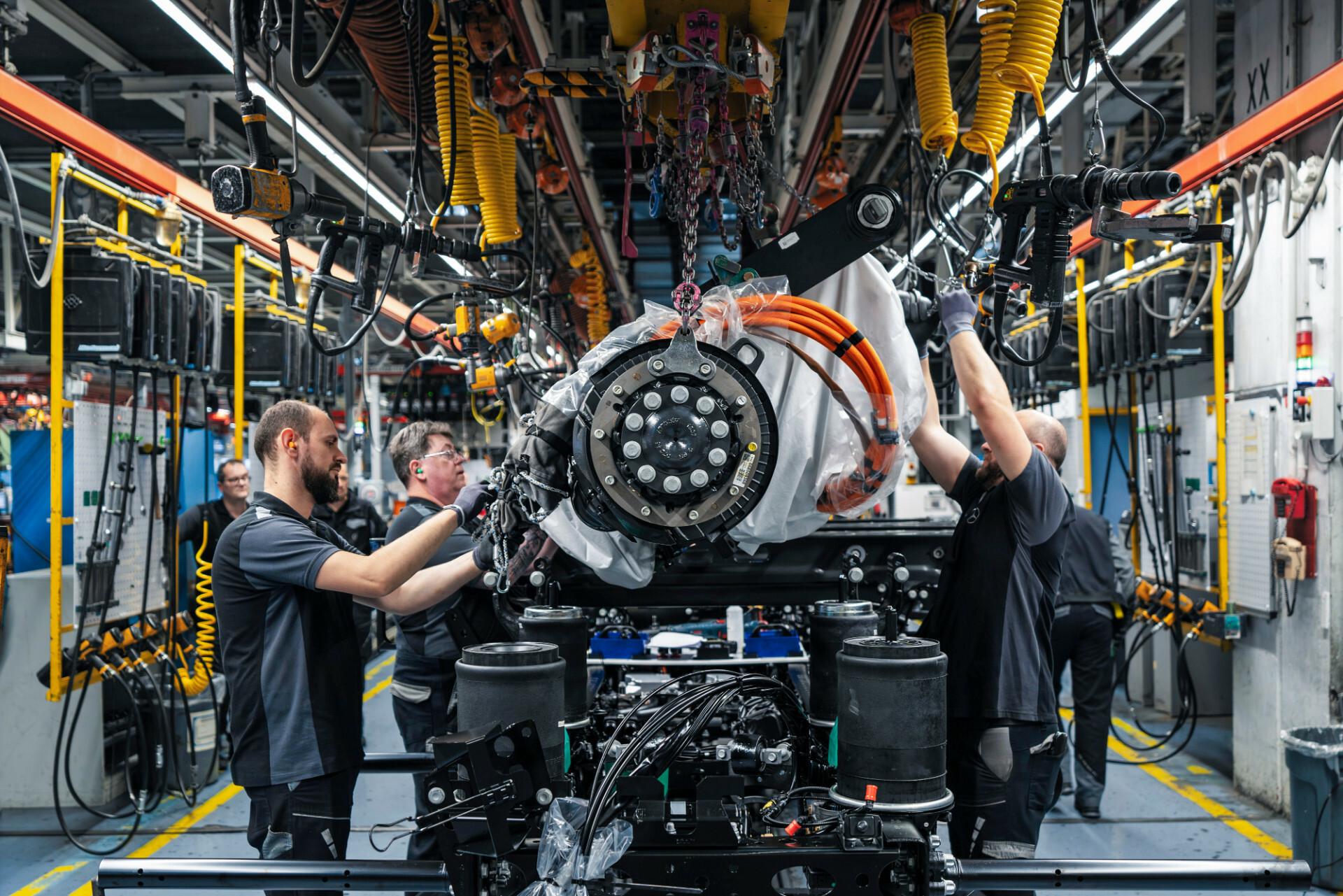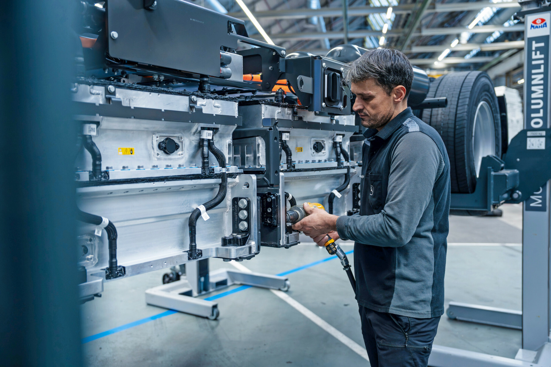 Der eActros 600 wird auf der bestehenden Montagelinie der Wörther A-Baureihen-Produktion gefertigt, parallel und flexibel neben den Lkw, die einen Dieselantrieb bekommen. In dieser Produktionshalle erhält er auch sämtliche elektrische Komponenten. Am Ende des Bands erfolgt die Inbetriebnahme des Gesamtsystems: Ab dann ist der Lkw fahrbereit und durchläuft schließlich den Finish-Prozess und die Endabnahme wie alle anderen Lkw auch.
