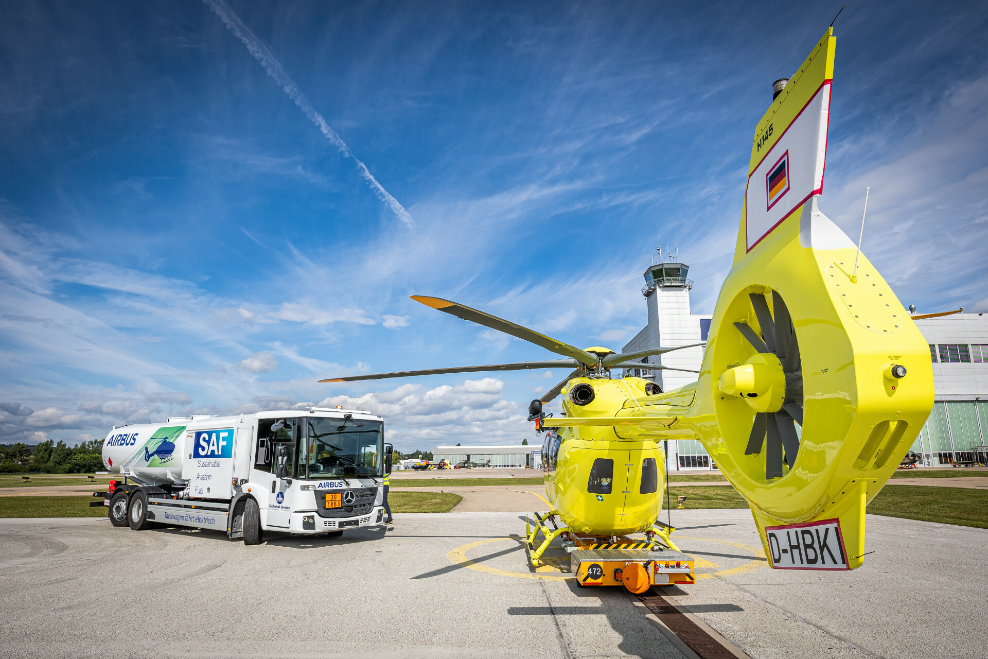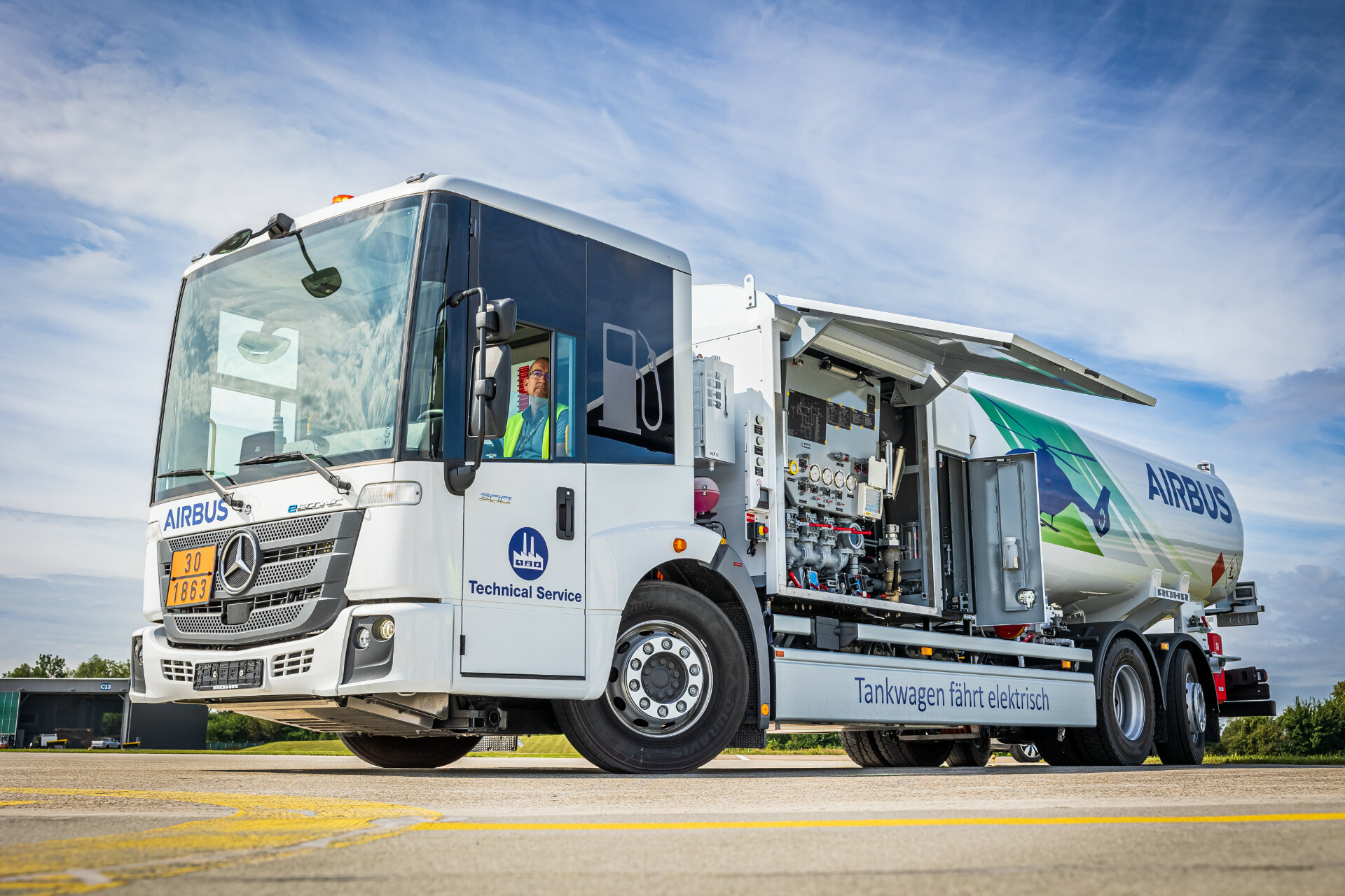 Auf seinem Betriebsgelände in Bayerisch-Schwaben vertankt Airbus seit 2023 vermehrt Treibstoff mit SAF-Anteil und setzt zunehmend auf vollelektrische Fahrzeuge, um seinen Nutzfahrzeug-Fuhrpark in Zukunft rein elektrisch betreiben zu können. Die Beschaffung des elektrischen Tankwagens, der vor Ort so viel wie möglich mit Ökostrom geladen wird, ist ein weiterer Schritt zur Umsetzung dieses Vorhabens.