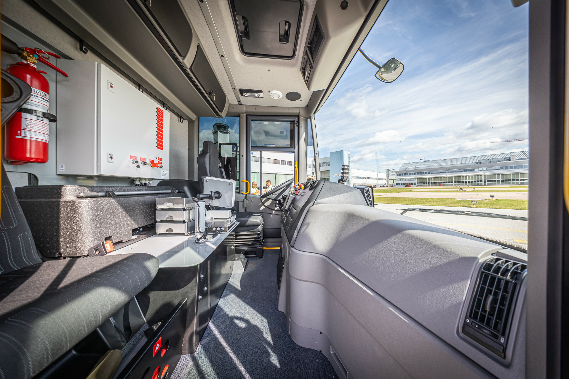 Der Mercedes-Benz eEconic ist durch seine bewährten Sicherheitsfeatures für den Einsatz in dynamischen Arbeitsumgebungen prädestiniert. Der Blickwinkel des Fahrers ist durch die tief gezogene Panoramascheibe umfassender als bei vielen anderen Lkw-Modellen. Zudem ermöglicht die niedrige Sitzposition dem Fahrer, das Geschehen auf Augenhöhe zu seinen Kollegen auf dem Flugfeld wahrzunehmen und mit ihnen Blickkontakt zu halten. Trotz des langen Radstands von 5.5 Metern hat der eEconic dank der gelenkten Hinterachse einen verhältnismäßig engen Kurvenradius. So kann das etwa 11 Meter lange Basisfahrzeug problemlos zwischen dem Bodenpersonal, anderen Fahrzeugen, landenden Helikoptern und startenden Rotorblättern rangieren. Das Sicherheitskonzept wird durch Schulungen für das Bodenpersonal komplettiert, die die Experten von Mercedes-Benz Special Trucks, ROHR Spezialfahrzeuge GmbH und Airbus konzipiert haben.