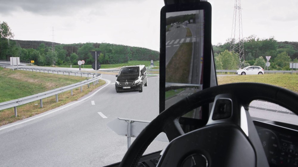 Der neue Mercedes-Benz Actros mit MirrorCam. Durch den Wegfall der klassische Spiegel freie Sicht durch die Seitenscheibe.