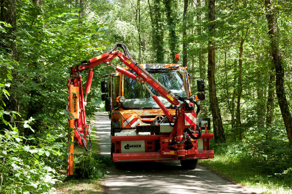 Mit einem Ausleger UNA 600 der Maschinenfabrik Gerhard Dücker, der mit einer Astschere gekoppelt ist, stellt sich ein Unimog Geräteträger des Typs U 219 vor. Der Auslegearm ist im Frontanbau an der Schnellwechselplatte des Fahrzeugs montiert und wird über Joystick, Multicontroller und Touchdisplay gesteuert. Der mittig montierte Ausleger mit 7,30 Metern Reichweite lässt sich seitlich um 1,70 Meter nach links oder rechts verschieben – damit sind auch Äste in großer Höhe, über Bäche hinweg oder in größerer Entfernung zur Straße für den Pflegeschnitt problemlos erreichbar.