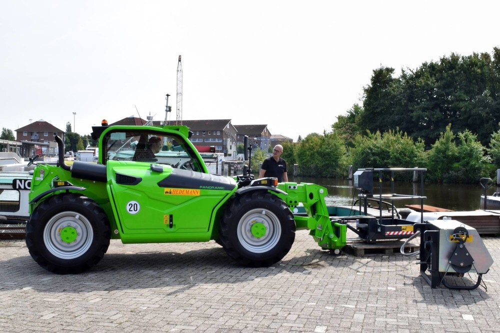 Auch beim Be- und Entladen der Schiffe kommt der P 30.10 zum Zuge. Große Teile wie Dammbalken von 30 x 30 cm bis zu 6 m Länge sind im Alltag auf einen Ponton oder ins Arbeitsschiff zu verladen „Mit dem Merlo müssen wir nicht extra einen Mobilseilkran holen. Ist ja auch eine Kostenfrage“, teilt der Auricher mit.