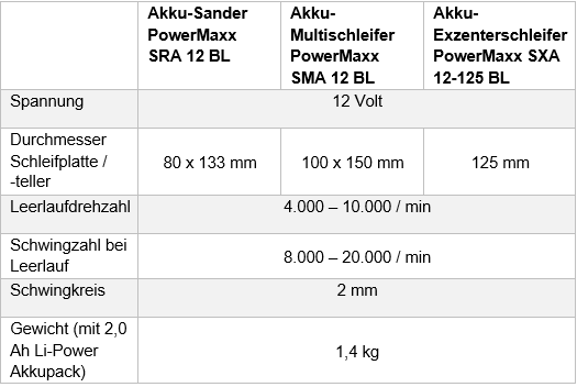 Für jedes Einsatzgebiet gibt es unter den drei neuen Akku-Schleifern den richtigen Spezialisten. Der Akku-Exzenterschleifer PowerMaxx SXA 12-125 BL erzielt mit seiner exzentrischen Schleifbewegung beste Ergebnisse in Sachen Oberflächenqualität. Der Akku-Sander PowerMaxx SRA 12 BL eignet sich mit seiner rechteckigen Schleifplatte ideal für kleine Flächen und Kanten, wie bei Sicherungskästen, an Türfuttern oder Fensterrahmen. Und der PowerMaxx SRA 12 BL auch im Set mit der Schleifplatte des PowerMaxx SMA 12 BL erhältlich – dank des Wechselsystems können Anwender die Platte mit nur einer Schraube sekundenschnell austauschen und so ganz einfach zwischen Sander und Multischleifer wechseln. Die Drehzahl stellen sie bei jedem der Schleifer stufenlos ein – das ist besonders bei Materialien hilfreich, die eine reduzierte Abtragleistung brauchen, wie feine Spachtelmaterialien, dünne Vorlacke, Füllerschichten oder Furniere.