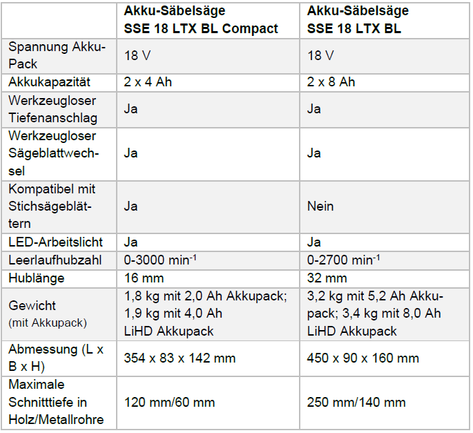 Bei Arbeiten in besonders schwer zugänglichen Bereichen ist die kleine SSE 18 LTX BL Compact die richtige Wahl. Die vielseitige Säge überzeugt mit ihrer kompakten Bauform und ihrem bürstenlosen Motor. Noch mehr Säge-leistung liefert die SSE 18 LTX BL. Mit einer Hublänge von 32 Millimetern und ihrem Brushless-Motor punktet die Säge mit Kraft und Ausdauer. „Beide Sägen sind sehr leistungsstark und gleichzeitig echte Leichtgewichte. Dafür sorgt unter anderem ihr bürstenloser Motor“, erklärt Produktmanager Leonard Sautter. „Denn im Vergleich zu Modellen mit Bürstenmotoren arbeiten die Anwender mit den neuen 18-Volt-Modellen jetzt noch schneller und schaffen pro Akkuladung mehr Schnitte“, so Sautter.