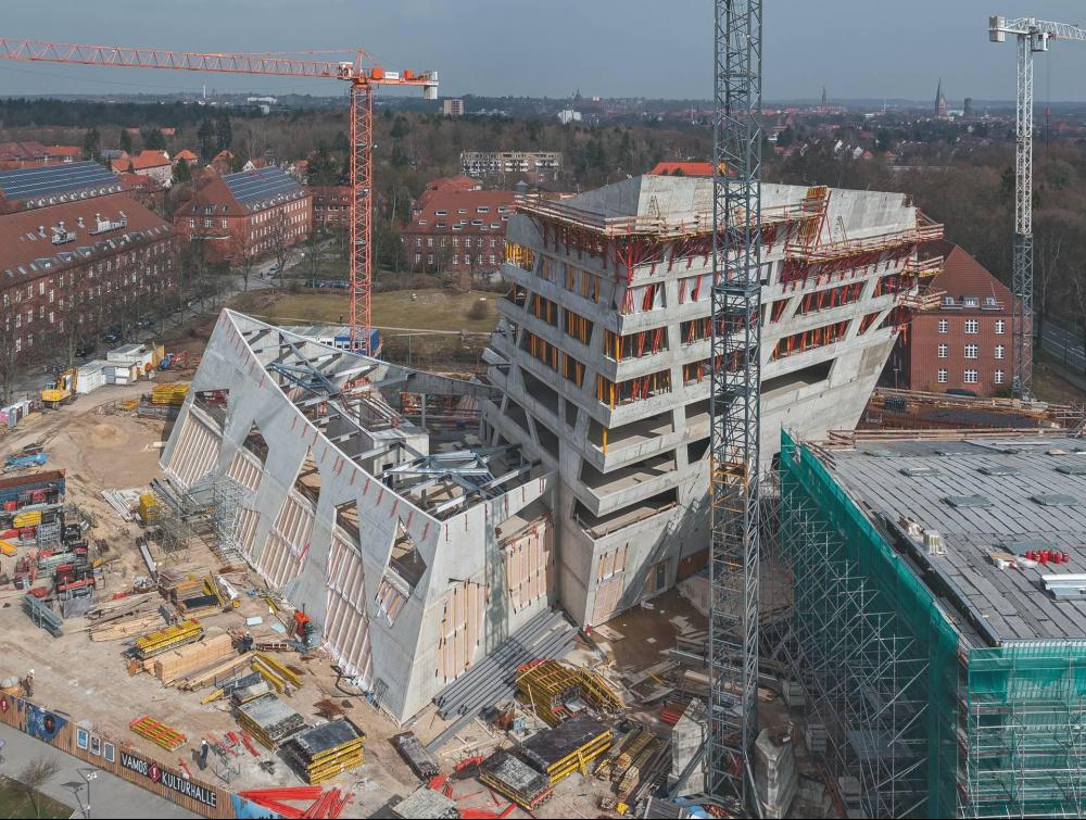 Lüneburg. Um den außergewöhnlichen Architektenentwurf von Daniel Libeskind kosteneffizient realisieren zu können, basierte das dreidimensional angepasste Schalungs- und Gerüstkonzept der Peri Ingenieure auf der Verwendung mietbarer Systemkomponenten sowie einer kompetenten Baustellenbetreuung.