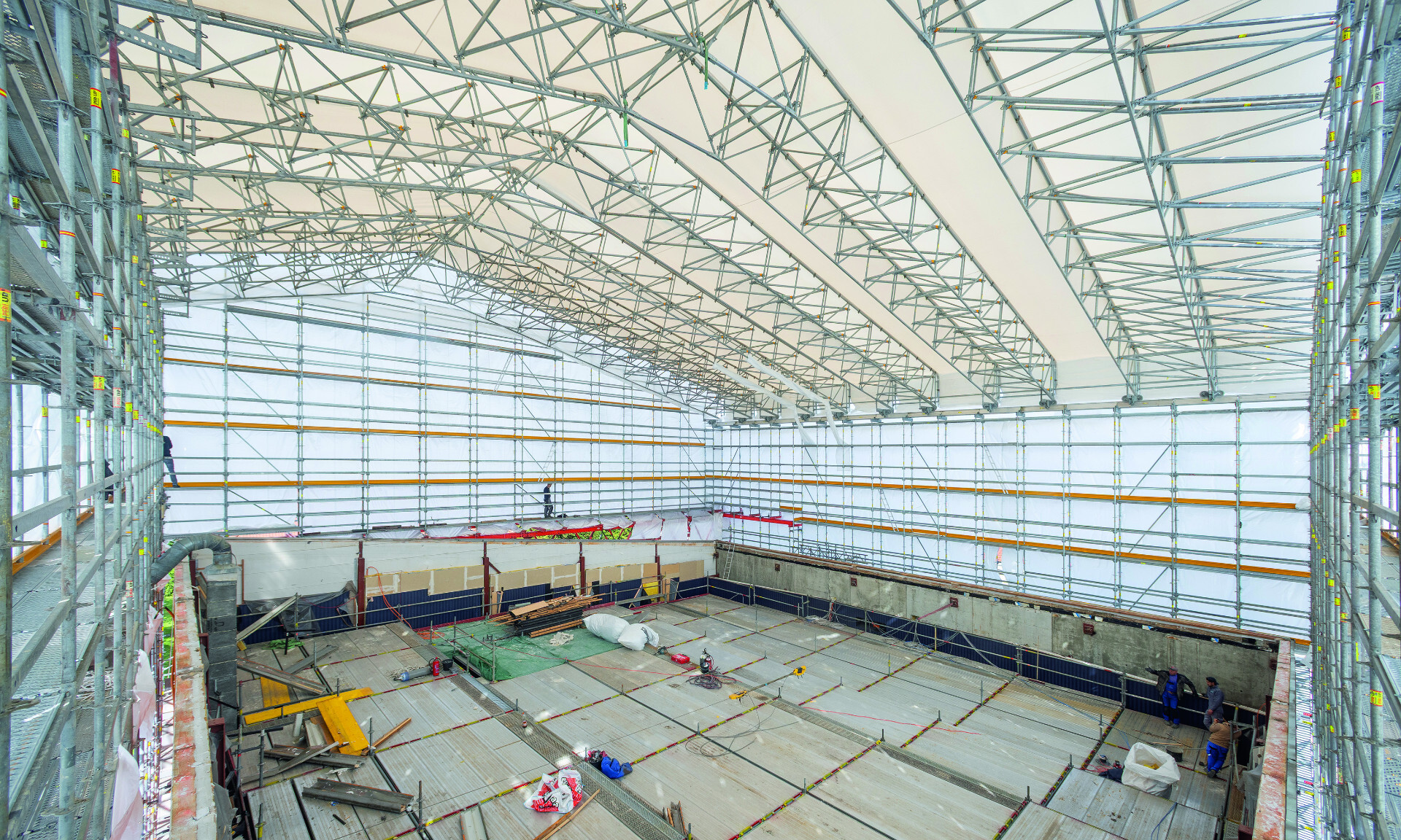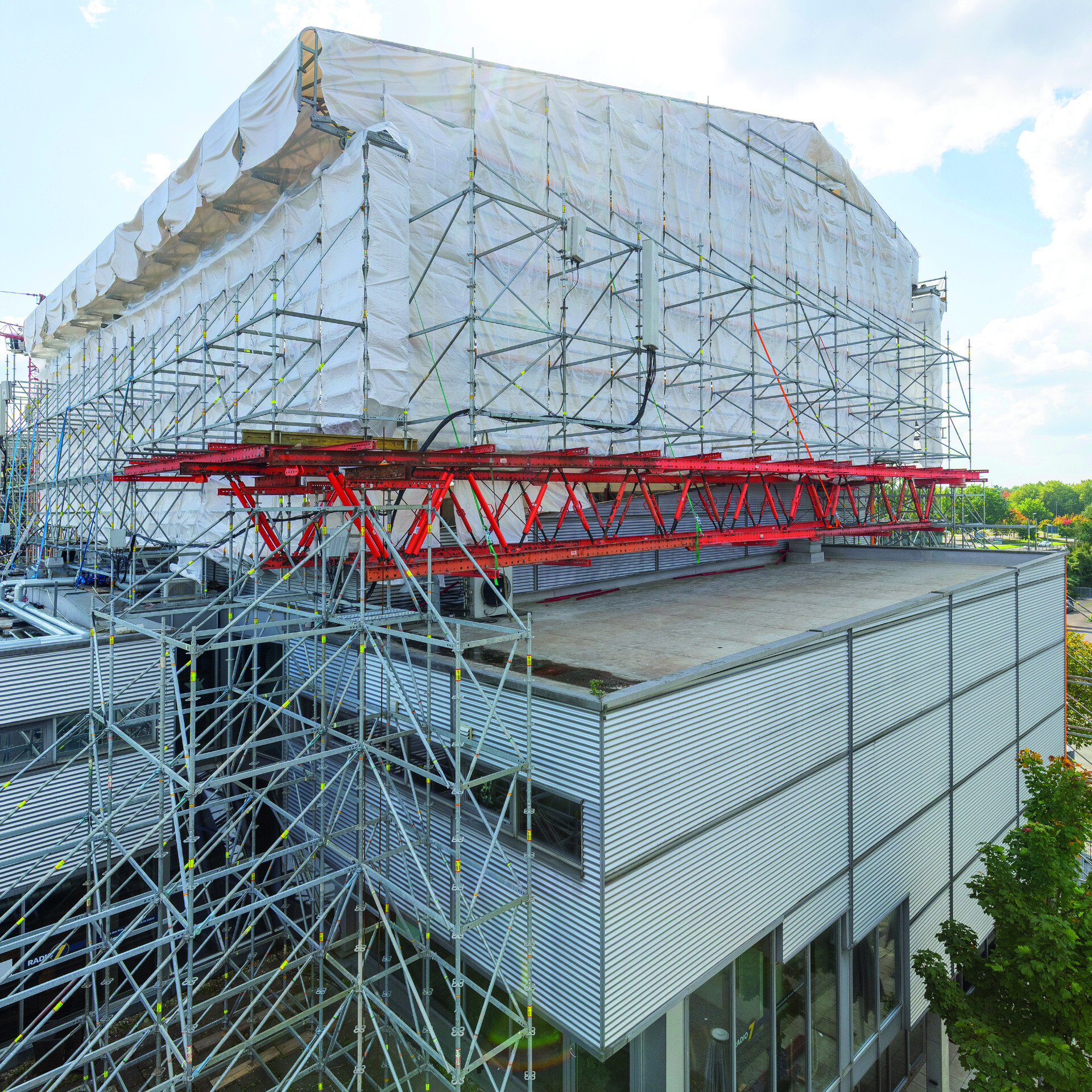 Der straffe Zeitplan war für alle Beteiligten anspruchsvoll, denn die Betreiberfamilie wollte das IMAX Kino trotz der komplexen baulichen Eingriffe an der Gebäudesubstanz noch zum Jahresende 2025 einweihen. Insbesondere die Anforderungen an den Gerüstbau waren äußerst vielfältig: Ein temporäres Wetterschutzdach musste das Gebäude während der Bauarbeiten vor äußeren Witterungseinflüssen schützen, gleichzeitig aber sollten großformatige Stahlträger der bestehenden Dachkonstruktion mit dem Kran ausgehoben und neues Baumaterial eingehoben werden können. Zudem war eine Gerüstverankerung an der Außenfassade nicht möglich – und die Dachflächen der angrenzenden Gebäude durften nicht beziehungsweise nur sehr gering belastet werden.