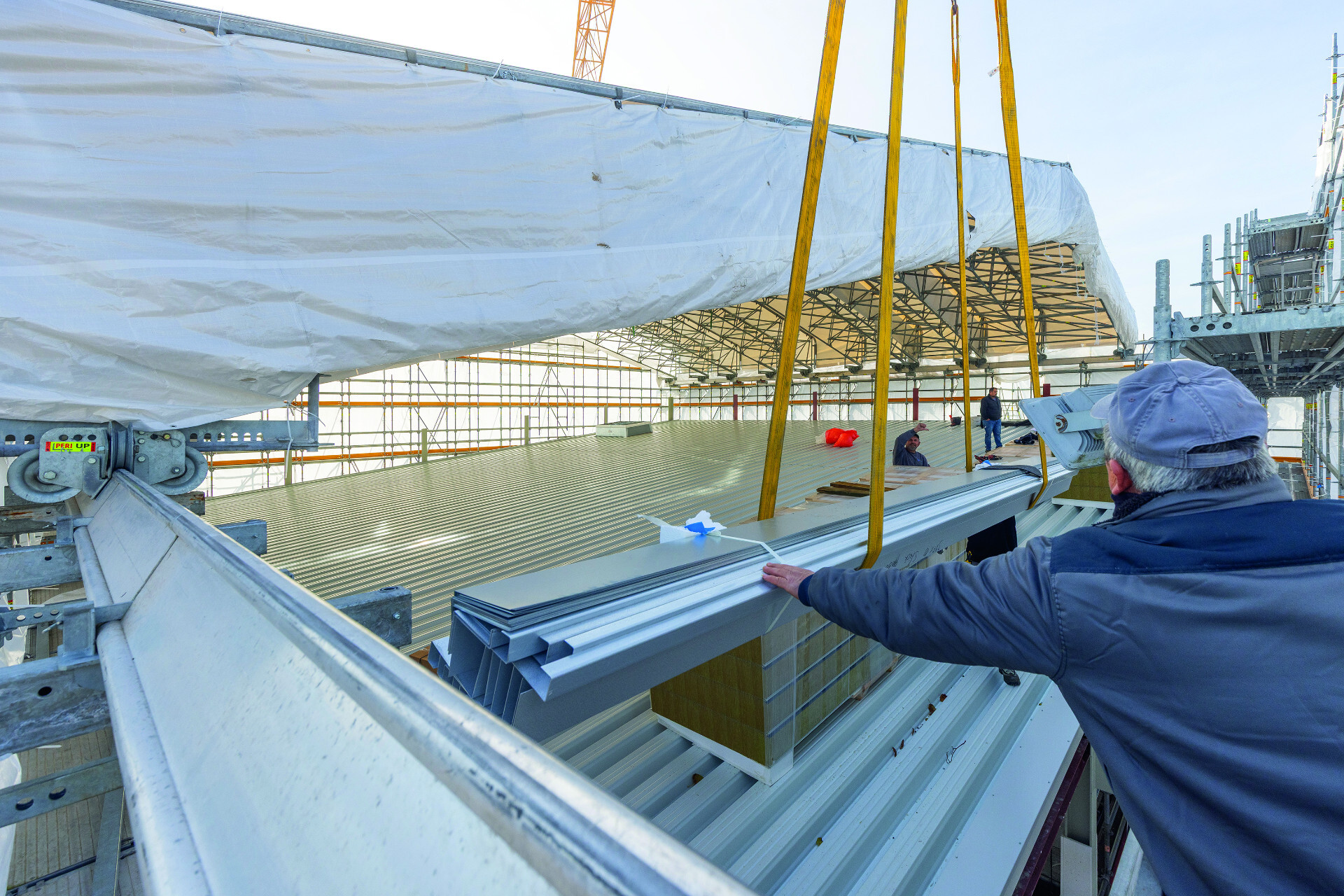Die Lösung der Dullenkopf Gerüstspezialisten: Ein verfahrbar ausgebildetes PERI UP Wetterschutzdach mit 25 m Spannweite. Dieses schützte einerseits vor Frost, Regen, Schnee und Hitze, dennoch ließen sich einzelne Dachsegmente für eine Materialein- und -ausbringung verschieben und das Dach damit bedarfsweise schnell öffnen und schließen. Die Auflagerung der Dachkonstruktion erfolgte auf einem PERI UP Gerüst, das außenseitig durch die räumliche Verbreiterung in Verbindung mit entsprechender Ballastierung weitestgehend freistehend ausgeführt werden konnte.