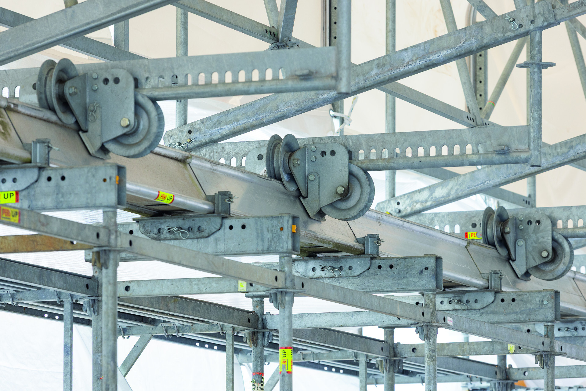 Um das Dach zu öffnen, lassen sich die mit Fahrwerksrollen ausgestatteten PERI UP Dachsegmente mit geringem Kraftaufwand per Hand verschieben.