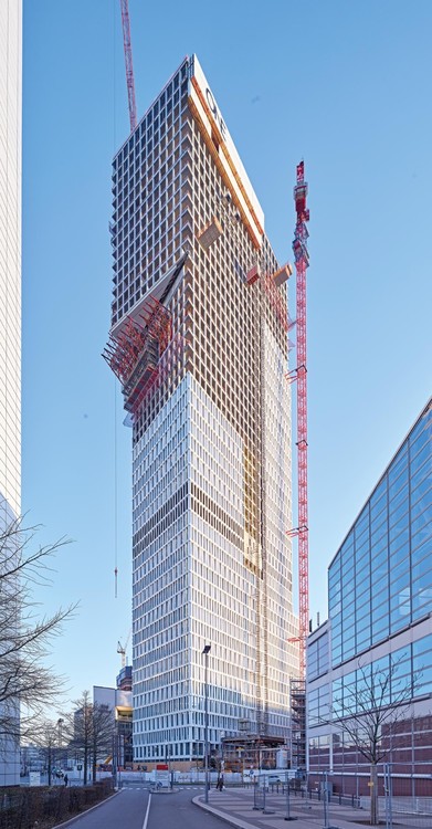 Die Kombination aus PERI Standardsystemen mit individuellen Systemlösungen lieferte eine passgenaue Lösung für sämtliche spezifische Anforderungen des Großprojekts. Das optimale Zusammenspiel der Systeme aus einer Hand ermöglichte darüber hinaus eine Realisierung der Regelgeschosse im Wochentakt. So konnte das Projekt unter Einhaltung des straffen Bauzeitplans realisiert werden – und wurde pünktlich zum Juli 2022 fertiggestellt.