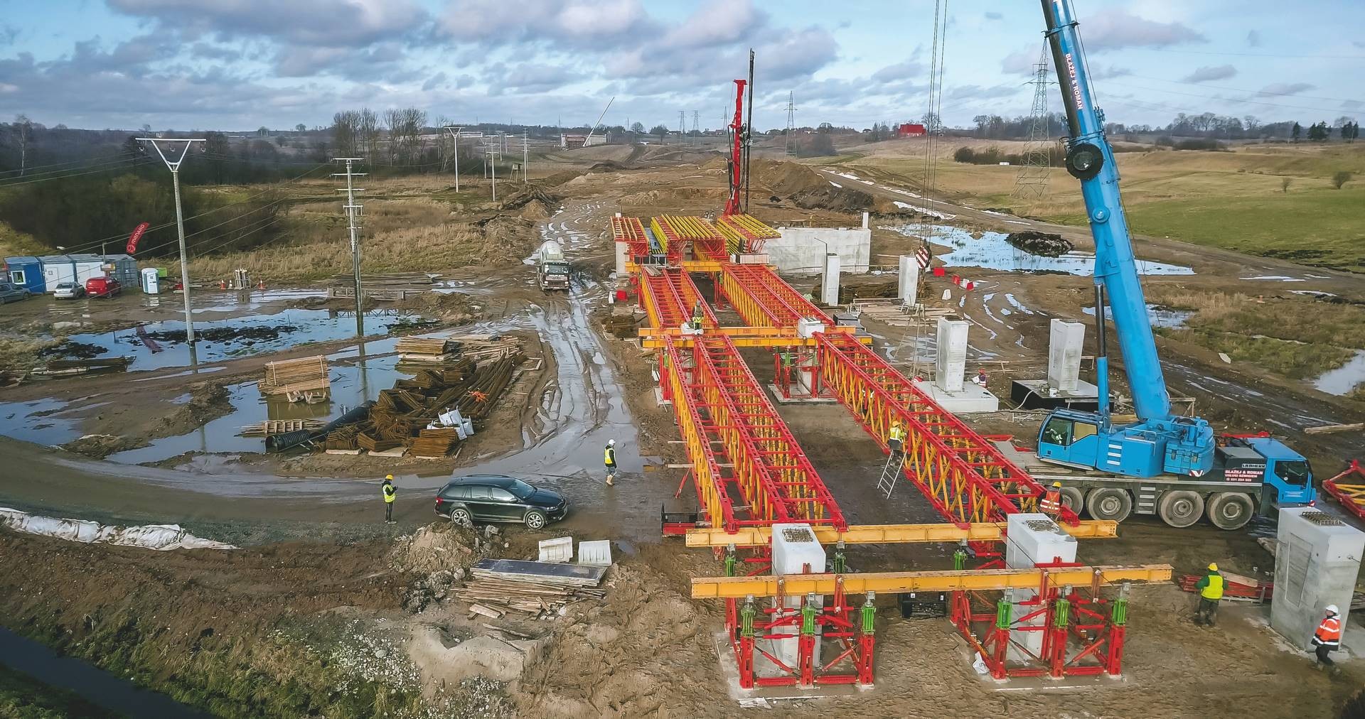 Die 160 m lange Straßenbrücke M‑8 bildet den Kern der insgesamt 12 km langen Umfahrung der Stadt Neustettin. Als Teil der Erweiterung der Schnellstraße S‑11 quert die Brücke mit zwei Fahrspuren je Fahrtrichtung das Feuchtgebiet rund um den Wilczy Kanal. Schwierige Baugrundbedingungen erforderten eine nicht alltägliche Traggerüstlösung, die sich aufgrund der großen Spannweiten und hohen Lasten nicht mit Standardsystemen umsetzen ließ. PERI lieferte für diese Anforderungen eine effiziente Lösung auf Basis des Ingenieurbaukastens VARIOKIT, die die Planung, die Vormontage und Lieferung als auch die Projektbegleitung umfasste.