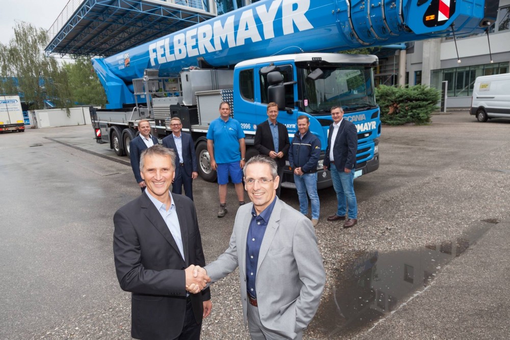 Wels (Österreich), Juli 2018 - Der erste SKYperformance STEIGER® T 900 HF wurde kürzlich durch Bernhard Reinisch, Geschäftsführer der Ruthmann GmbH in Österreich an die Firma Felbermayr übergeben. Die Übergabe fand in der Felbermayr Zentrale in Wels, Österreich statt.
