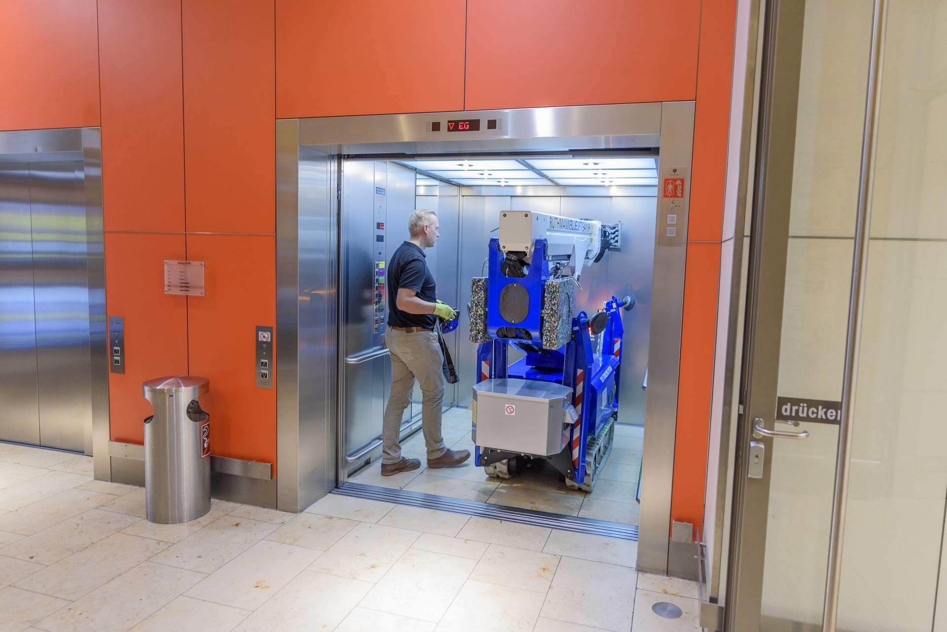 Unter Begleitung der Haustechnik geht es auf den abriebfreien Gummiketten ins Innere des Gebäudes. Vereinzelte Passanten, die auf dem Weg zur U-Bahn-Station im Gebäudekomplex unterwegs sind, werden durch akustische Signale gewarnt.