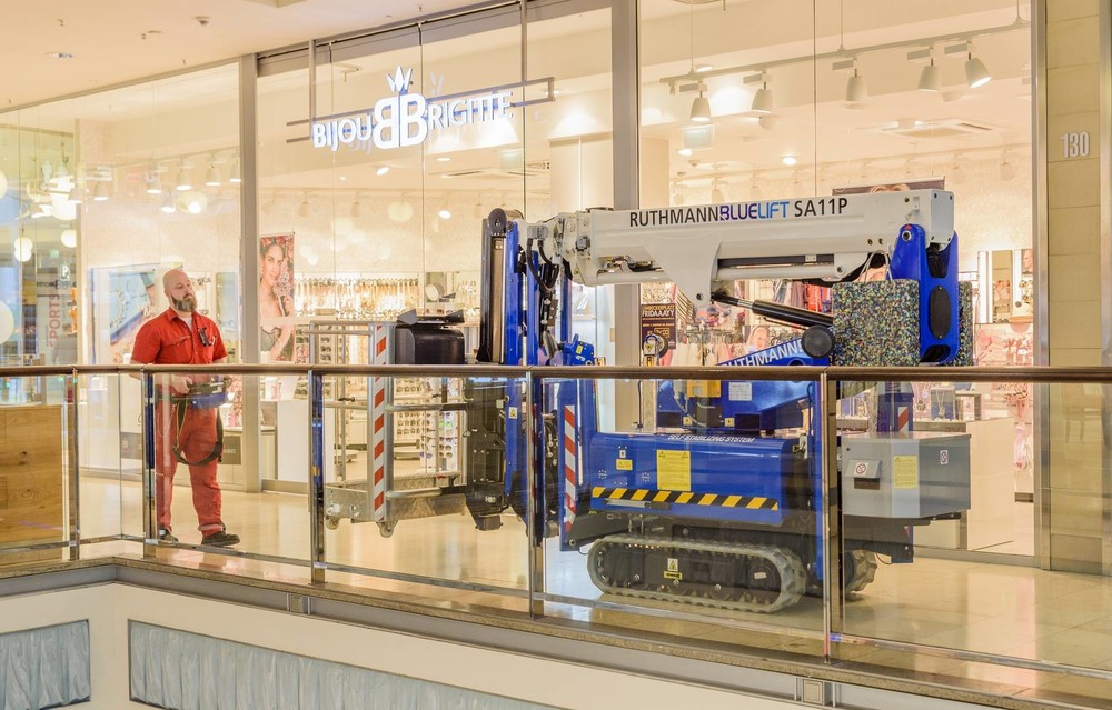 Als die Firma RUTHMANN auf der Suche nach einer Location für Produktvideos den Limbecker Platz kontaktierte, erfuhr der Leiter der Haustechnik Jörg Breitkreuz von der neuen RUTHMANN BLUELIFT Arbeitsbühne SA 11 P. Dieser völlig neue Typ Arbeitsbühne ist nicht nur leicht und sehr kompakt, er kann auch Einsatzorte bis zu einem Meter Unterflur erreichen. Eine mögliche Lösung für die Zugangsprobleme im Einkaufszentrum?
