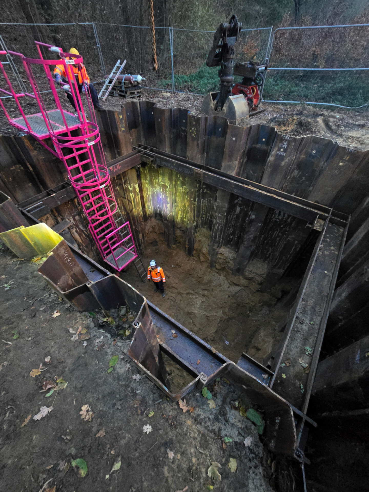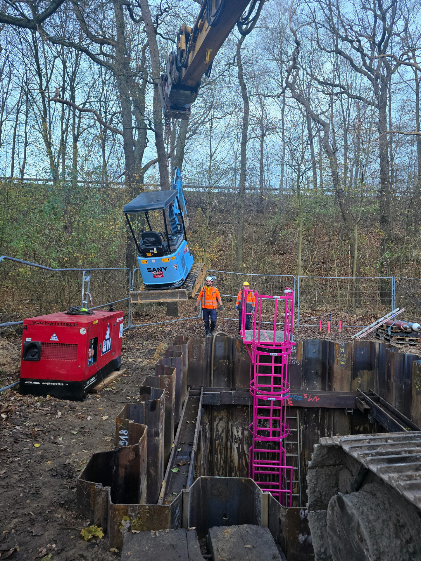 Die Baustelle in Marl gehört zu den anspruchsvolleren Projekten im kommunalen Tiefbau: Unter der A43 muss ein großes Stahlbetonrohr hindurchgepresst werden, durch das später eine Wasserleitung verlaufen wird. Dafür entstehen zwei Baugruben: eine Press- und eine Zielbaugrube. Beide sind tief, eng und nur unter strengen Auflagen zu bearbeiten.