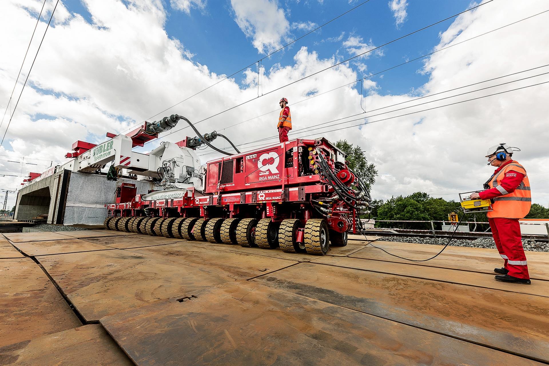 Ein Jahr hatte das Mainzer Unternehmen Zeit, eine ökonomische Lösung für diese komplexe Kombination aus Transport, Abriss und Montage zu entwickeln. Wichtiger Bestandteil dieses Einsatzes sind SPMT (Self Propelled Modular Transporter) von SCHEUERLE. Als Aufnahme für die neue Betonbrücke dient eine Seitenträgerbrücke zwischen den beiden, elektronisch miteinander verbundenen Transportplattformen. Insgesamt 20 SPMT Achslinien sind nötig, um die Gesamtlast von 570 Tonnen aufzunehmen. Auf die Seitenträgerbrücke installiert Riga Mainz eine selbstentwickelte und nach eigenen Aussagen in Deutschland bislang einmalige Verfahrenstechnik mit einer Hubkraft von 500 Tonnen. Ein weiterer Vorteil der zum Patent angemeldeten Hubanlage ist die verhältnismäßig geringe Bauhöhe. Der Transport inklusive Ladegut kann somit gefahrlos unter den Oberleitungen hindurch fahren. Das erspart dem Bauherrn eine Menge Zeit und erhebliche Kosten.