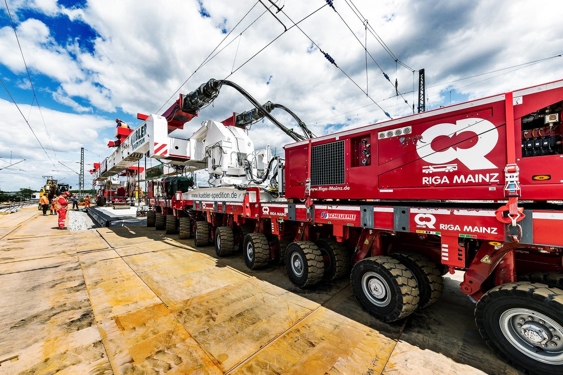 Unter den Oberleitungen hindurch hat Riga Mainz mit Hilfe von SPMT Modulen das neue Betonbrücke in die Lücke eingebracht.
