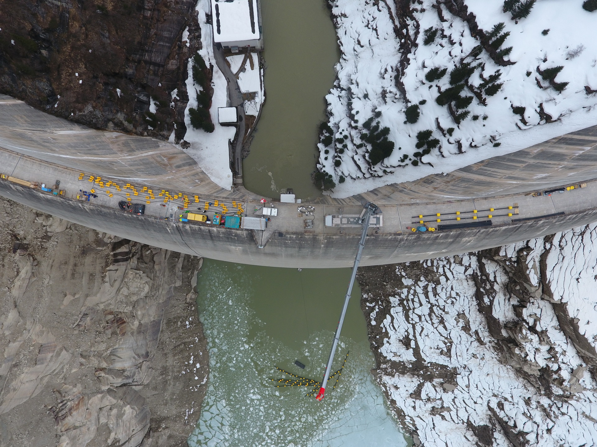 So erreichten Kran und LKWs sicher und im geplanten Zeitfenster die Staumauer, auf der das Team den AC 160-5 zügig aufbaute – trotz der extrem beengten Platzverhältnisse, die dort herrschten. Denn zwischen den Geländern standen gerade einmal sechs Meter Platz zur Verfügung. Und das auch nur theoretisch: „Bei unserer Arbeit durften wir mit der Abstützung nicht an den Rand der Staumauer, sodass wir nach Rücksprache mit dem zuständigen Ingenieur nur eine effektive Breite von 5,4 Metern nutzen konnten“, berichtet Josef Waser. Unter diesen Bedingungen konnte der Demag AC 160-5 jedoch mit der kleinen Abstützbasis von 5,3 Metern und dem Steuerungssystem IC-1 Plus seine entscheidenden Vorteile ausspielen. Ohnehin bestätigte sich die Wahl des AC 160-5 für diesen außergewöhnlichen Einsatz als bestmögliche Entscheidung: Der Lasttransport in 130 Meter Tiefe ließ sich wegen des starken Hubwerks mit bis zu 9,9 Tonnen Seilzug im direkten Zug absolut durchführen und mit seiner maximalen Seillänge von 330 Metern besaß der Kran mehr als ausreichende Reserven für den geforderten Lastfall.