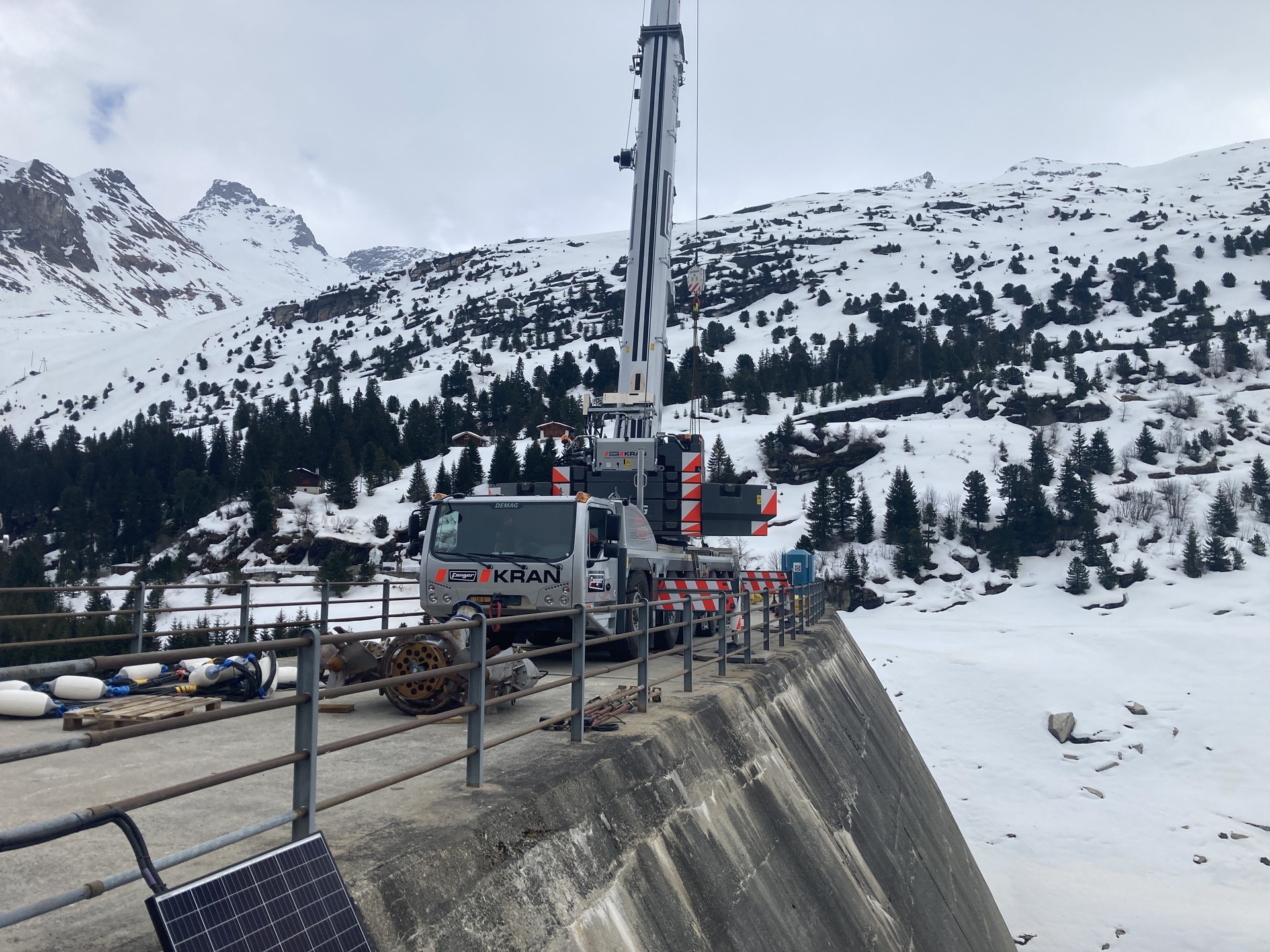 Um die bis zu 7,8 Tonnen schweren Saugbaggerteile, ein Ponton sowie Rohre und weiteres Material 130 Meter tief auf den Stausee herablassen zu können, wurde der Kran mit 32,9 Metern Hauptausleger und 46 Tonnen Gegengewicht gerüstet. „Wegen der Außenwölbung der Staumauer mussten wir mit einem Radius von bis zu 27,5 Metern arbeiten. Das stellte unseren Demag AC 160-5 jedoch vor keinerlei Probleme“, berichtet Josef Waser, der mit der Performance des Demag Krans ebenso zufrieden ist wie mit der des Demag Teams, zu dem er seit Langem einen guten Kontakt pflegt: „Es ist gut zu wissen, dass man in jeder Situation immer einen schnellen und guten Service in der Hinterhand hat,“ betont er. Bei diesem Einsatz lief jedoch wie in den allermeisten Fällen alles glatt, sodass der Kranfahrer sämtliche Hübe im Alleingang an nur einem Tag erledigen konnte.