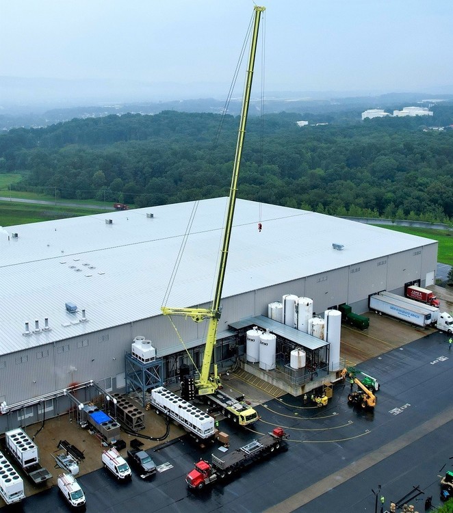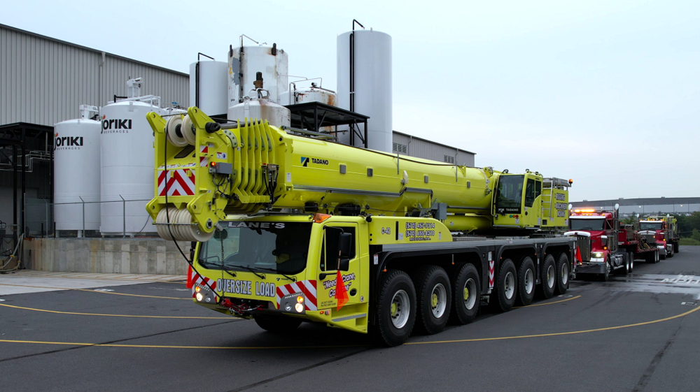 Pennsylvania - Lane's Crane Service aus Moosic, Pennsylvania, erhielt vor kurzem eine interessante Aufgabe vom Getränkeabfüller Joriki USA: vier 11 Meter lange und 8,6 Tonnen schwere Tanks auf dem Werksgelände des Unternehmens unter einem 12,5 Meter hohen Deckenbalken aufzustellen. Der AC 7.450-1 All-Terrain-Kran von Lane, der vom Tadano-Vertriebspartner Empire Crane erworben wurde, erwies sich als genau das richtige Gerät für diese Aufgabe.