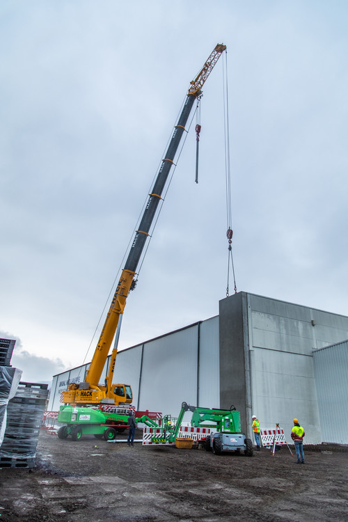 Auf dem Werksgelände der Firma Brohl Wellpappe stand das Heben und Stellen von 22 Tonnen-schweren Brandschutzwänden an einer der Industriehallen an. Das zuständige Bauunternehmen beauftragte die Hack Schwerlastservice GmbH mit dem Hub der 12 m langen Fertigbetonteile. So konnte der 220er unmittelbar nach Auslieferung seine speziellen Qualitäten im 2-Winden-Betrieb unter Beweis stellen. Dank dieser Ausstattung in Verbindung mit der hydraulisch abwinkelbaren 5,8-m-Spitze war es möglich, den Auftrag mit nur einem Kran durchzuführen.